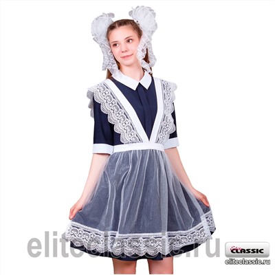 Изящный Фартук без грудки "Снежанна" из фатина с отделкой из кружева для школьниц младших и старших классов. Пояс и брители из хлопка. Брители и низ передника отделанны кружевом.