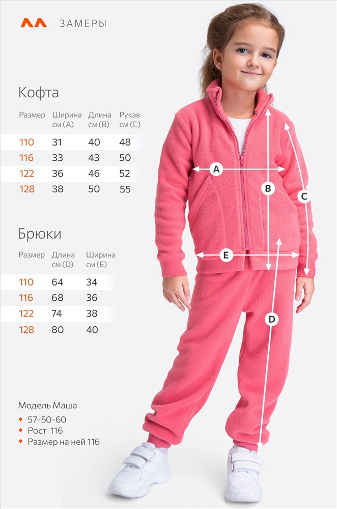 Размер 116: кофта: длина:43 см; ширина:33 см; длина рукава внешняя:50 см; длина рукава внутренняя:33 см.