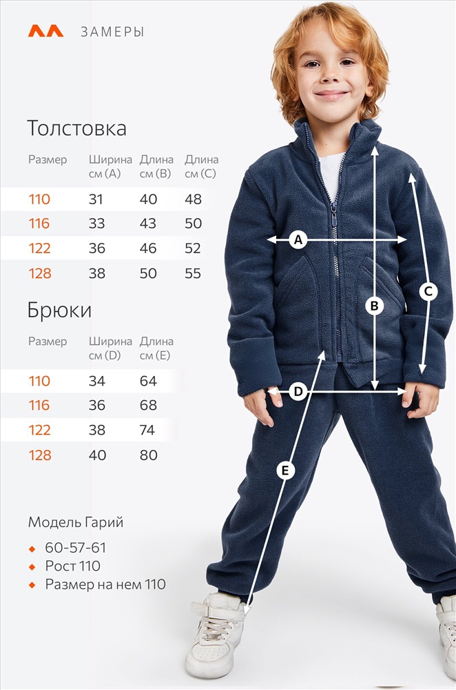 Рост модели 110 см, параметры: объем груди 60, объем талии 57, объем бедер 61 см. На нем размер 110.