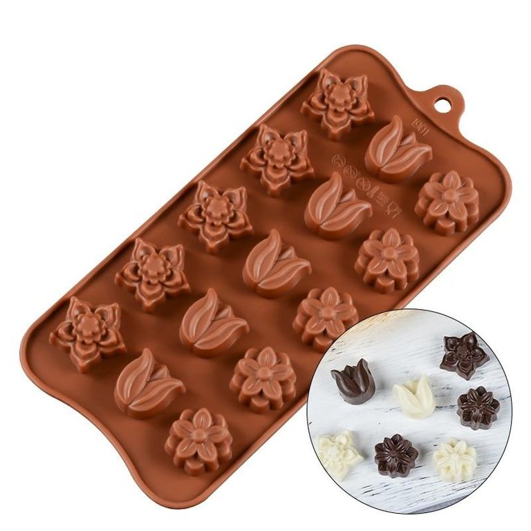Форма подходит для изготовления шоколадных конфет или для декора кондитерских изделий из шоколада, мастики, марципана. Форма из 15 ячеек, состоящая из 3-х видов цветов. Композиция цветы всегда в спросе на любой праздник, будь то шоколадный набор или декор на десерт к 8 марта, на день рождение или просто для приятного сюрприза без повода.