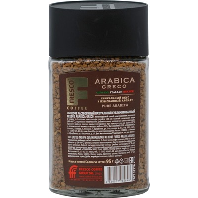Натуральный растворимый кофе. Состав: 100% арабика (сорт Arabica Caturra Amarelo).Greco назван в честь знаменитого римского кафе Antico Cafe Greco. Этот креппкий бленд был создан для вашего бодрого и яркого утра. Начните свой день правильно — с кофе FRESCO Arabica Greco. Приготовлен по технологии freeze dried, которая признается самой дорогой и качественной.Крепость — 10, аромат — 7, плотность — 9.