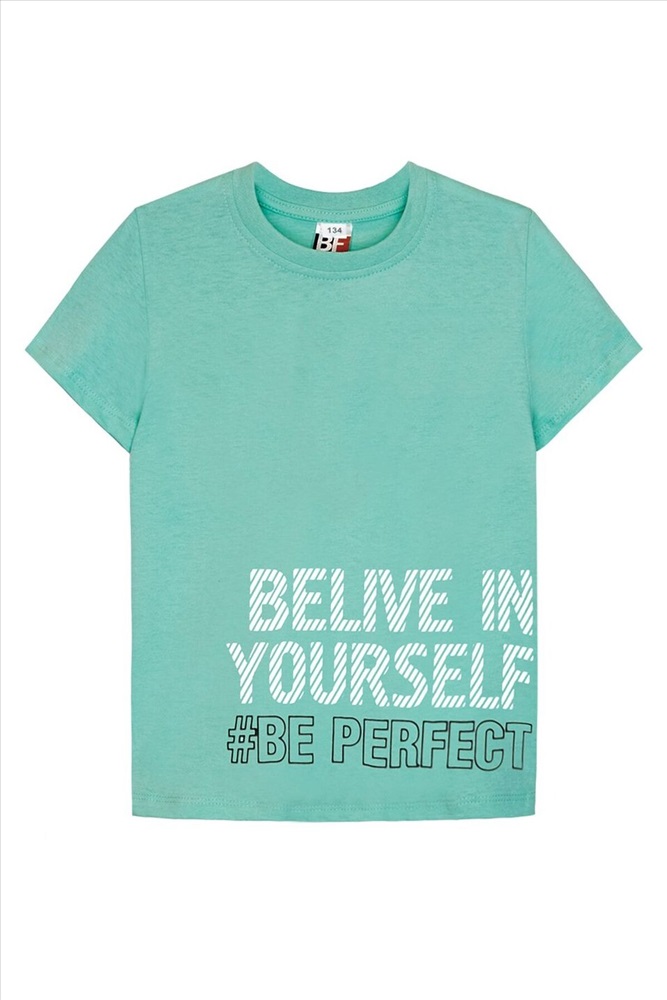 Футболка для девочки прямого силуэта с втачным коротким рукавом. Горловина круглая обработана воротником из рибаны. Горловина по полочке и спинке отстрочена нитками в цвет изделия. Низ изделия и рукавов обработан швом в подгибку. На полочке принт шелкография. Надпись переводится как "Верь в себя; Будь идеальной".