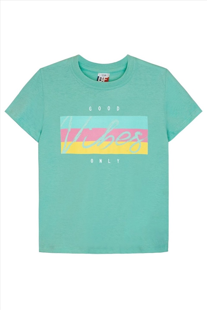 Футболка для девочки прямого силуэта с втачным коротким рукавом. Горловина круглая обработана воротником из рибаны. Горловина по полочке и спинке отстрочена нитками в цвет изделия. Низ изделия и рукавов обработан швом в подгибку. На полочке принт шелкография. Надпись переводится как "Только хорошее настроение".