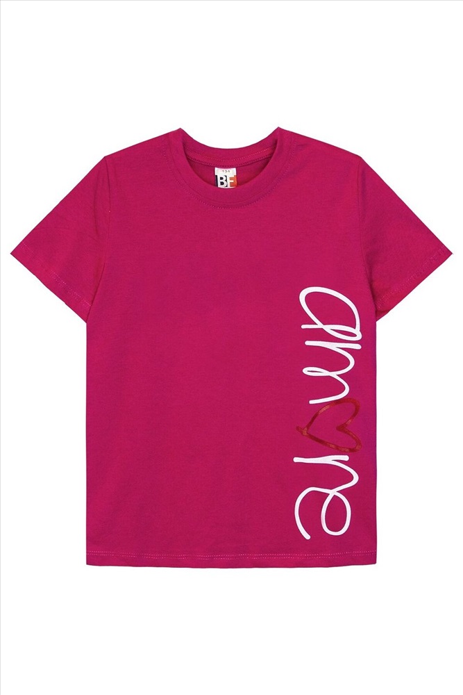 Футболка для девочки прямого силуэта с втачным коротким рукавом. Горловина круглая обработана воротником из рибаны. Горловина по полочке и спинке отстрочена нитками в цвет изделия. Низ изделия и рукавов обработан швом в подгибку. На полочке принт шелкография. Надпись переводится как "Любовь".