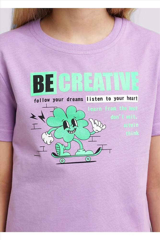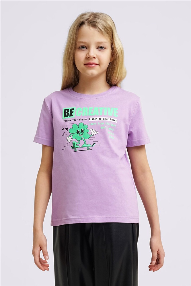 Футболка из 100% хлопка. Горловина обработана эластичной резинкой. По переду яркий стильный принт.