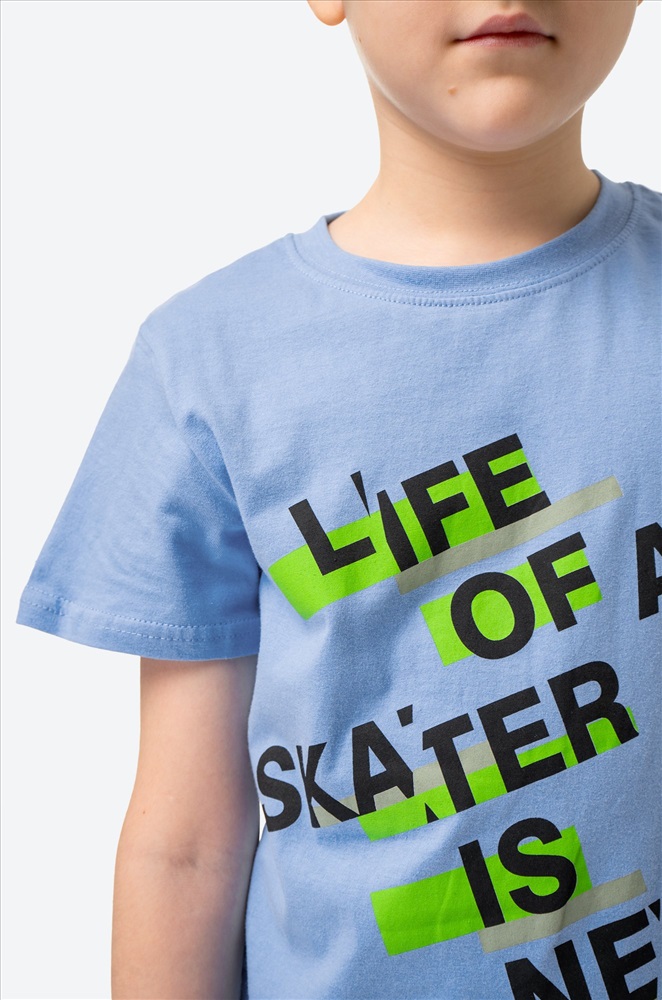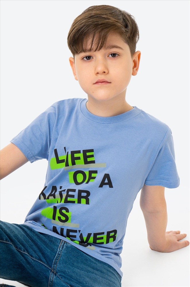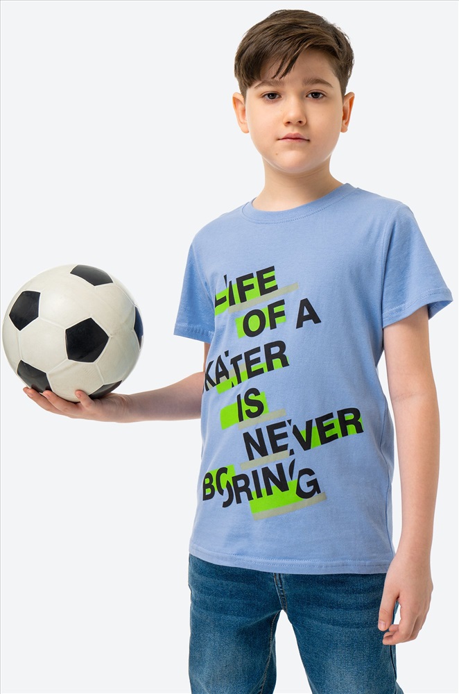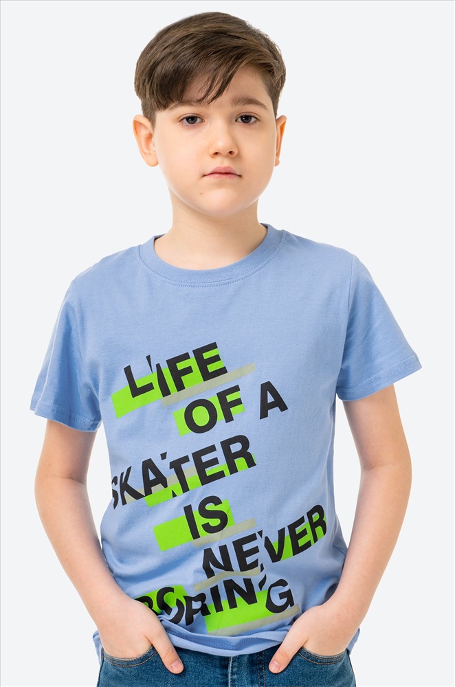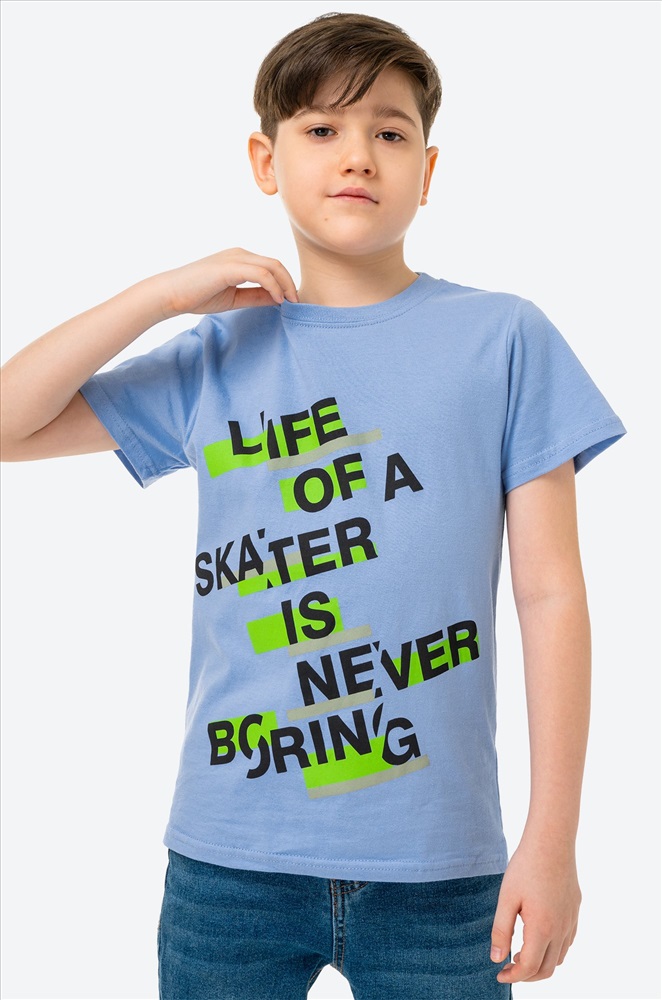 Классная футболка – верный спутник на лето! Голубая футболка для мальчика выполнена из 100% хлопкового трикотажа кулирная гладь. Летняя футболка со стильным принтом Надписи понравится каждому мальчику! Модель прямого кроя, эластичный вырез горловины аккуратно прилегает к шее не сдавливая ее.