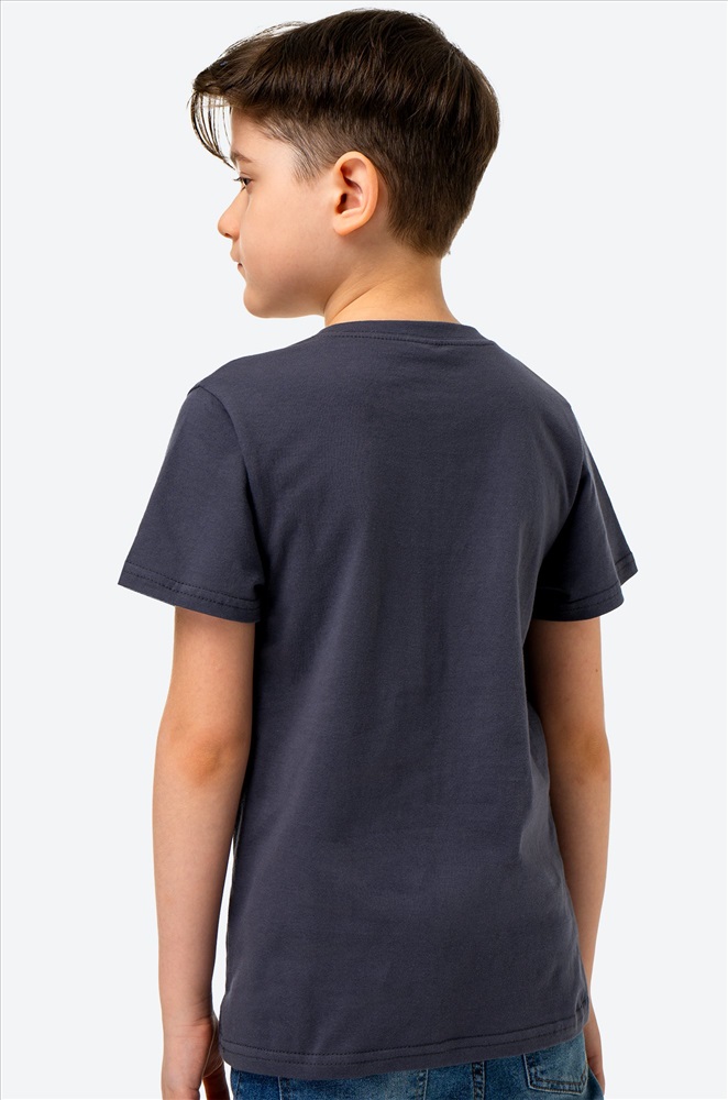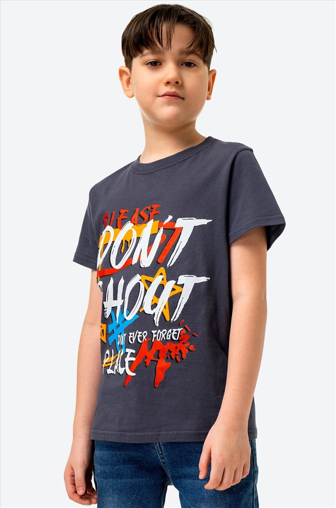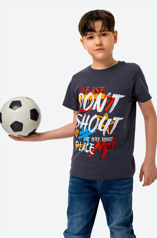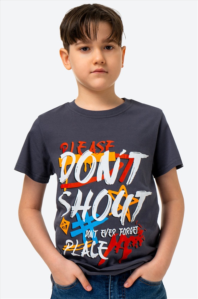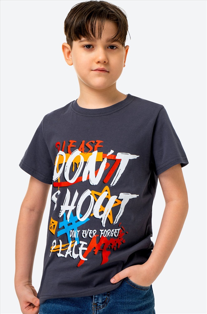 Классная футболка – верный спутник на лето! Темно-серая футболка для мальчика выполнена из 100% хлопкового трикотажа кулирная гладь. Летняя футболка со стильным принтом Надписи понравится каждому мальчику! Модель прямого кроя, эластичный вырез горловины аккуратно прилегает к шее не сдавливая ее.