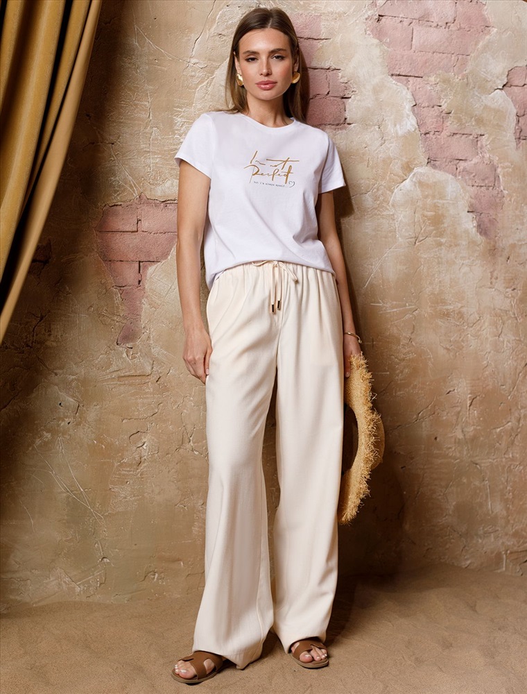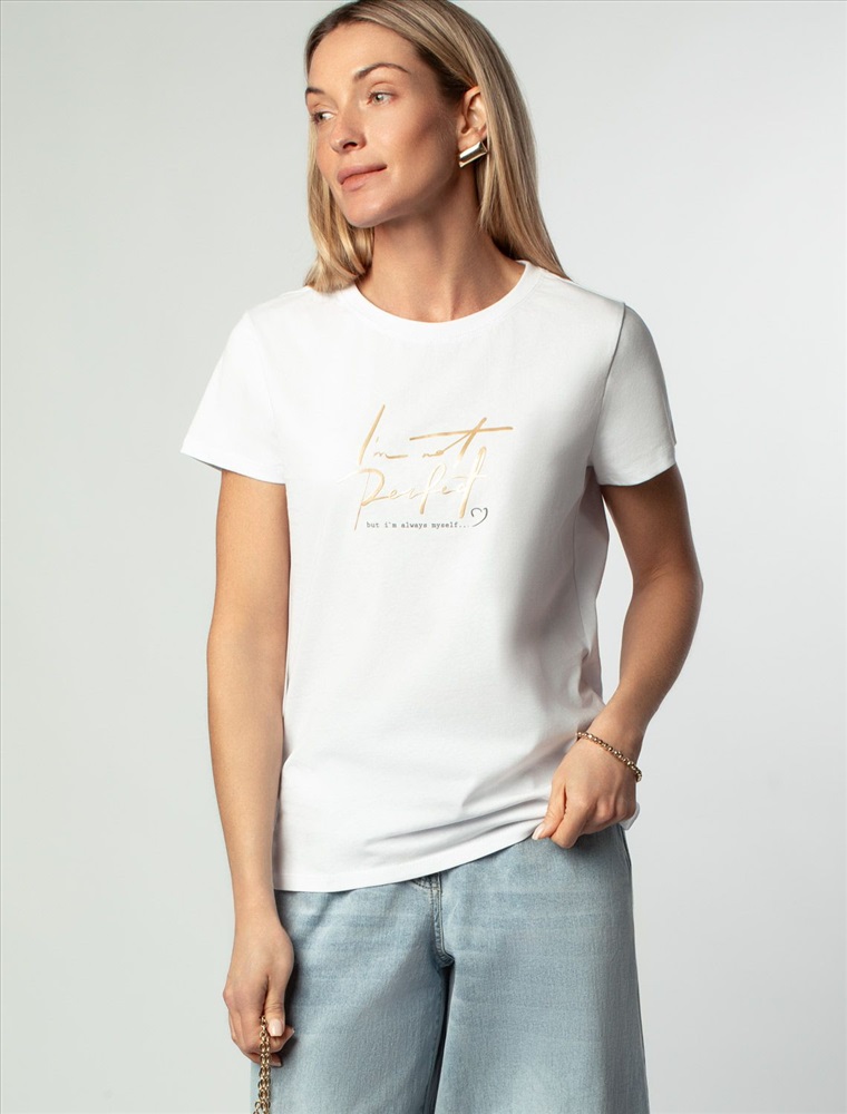 Перевод принта: "I am not perfect, but I'm always myself - я не идеальна, но я всегда настоящая". Футболка прямого кроя выполнена из 100% хлопка. Базовая модель дополнена лаконичным авторским принтом. Легко впишется в повседневный гардероб. Изделие хорошо держит форму и обеспечивает комфортный микроклимат в течение дня.