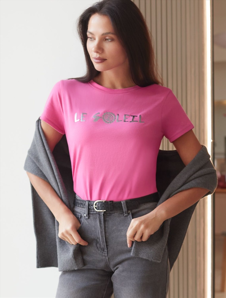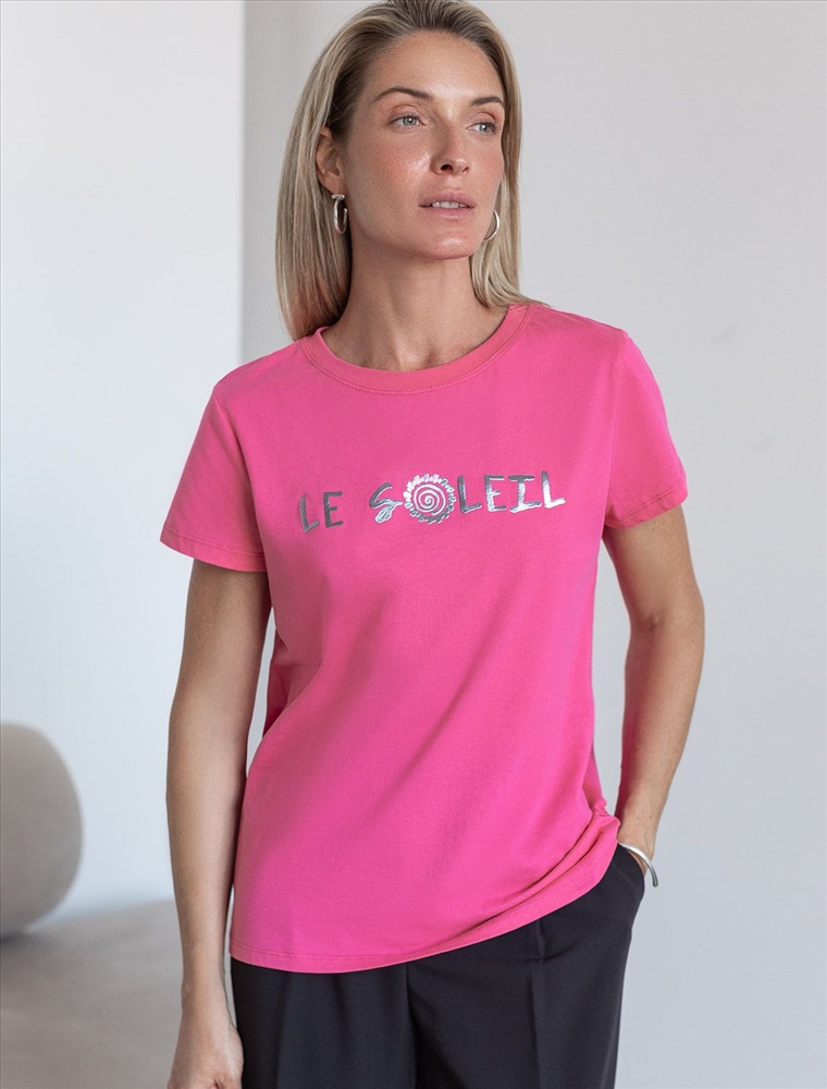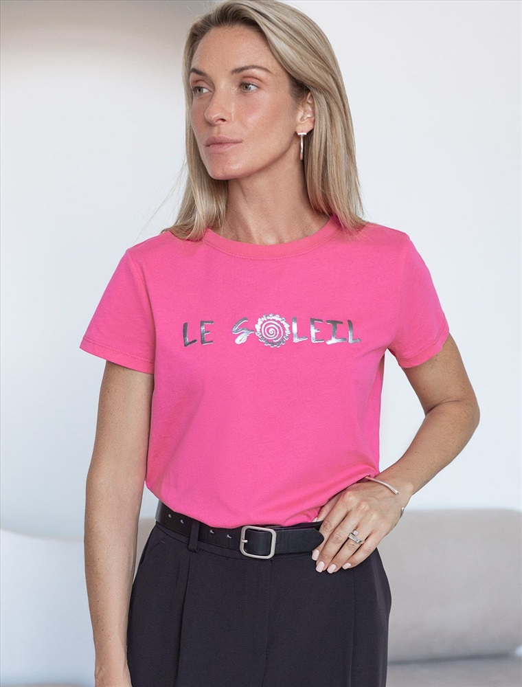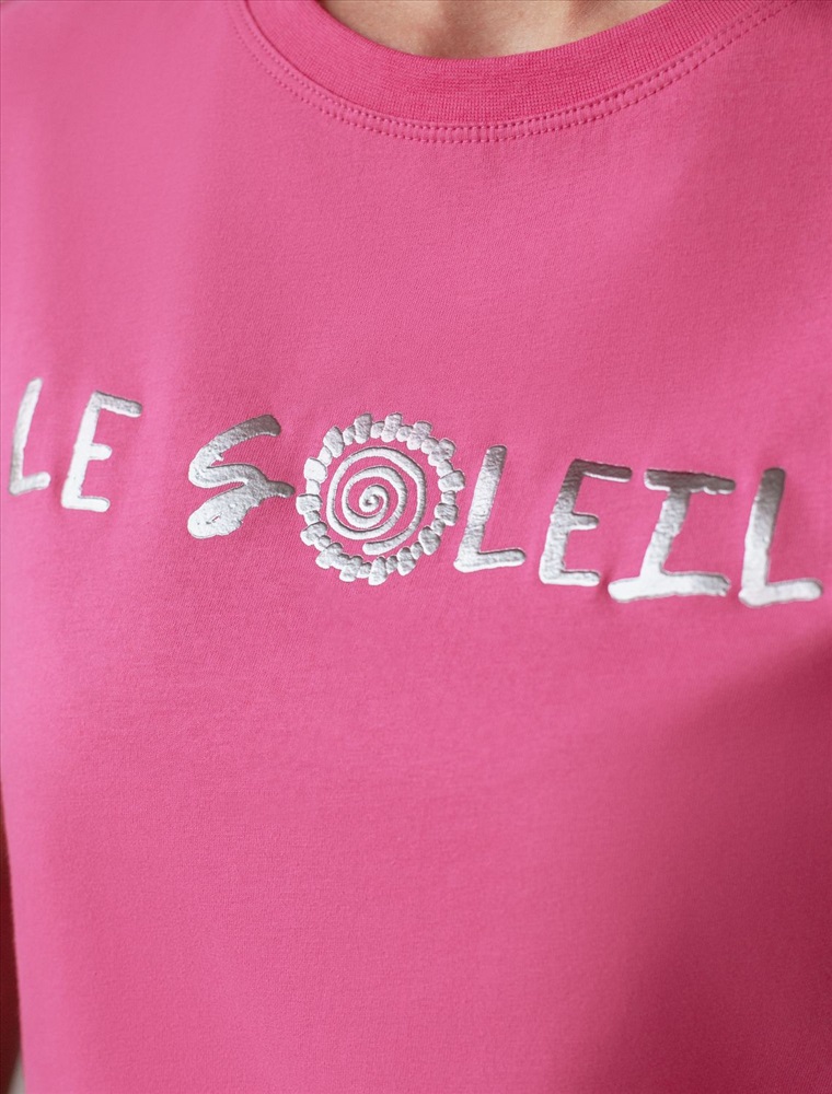 Плотность: 140 Г/м2 Футболка прямого кроя выполнена из 100% хлопка. Базовая модель дополнена лаконичным авторским принтом. Легко впишется в повседневный гардероб. Изделие хорошо держит форму и обеспечивает комфортный микроклимат в течение дня. Перевод надписи на принте: "le soleil (фр.) - солнце" Комментарии к товару