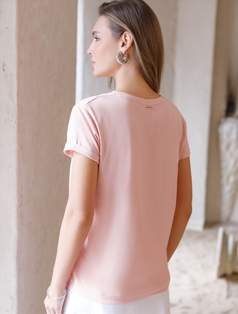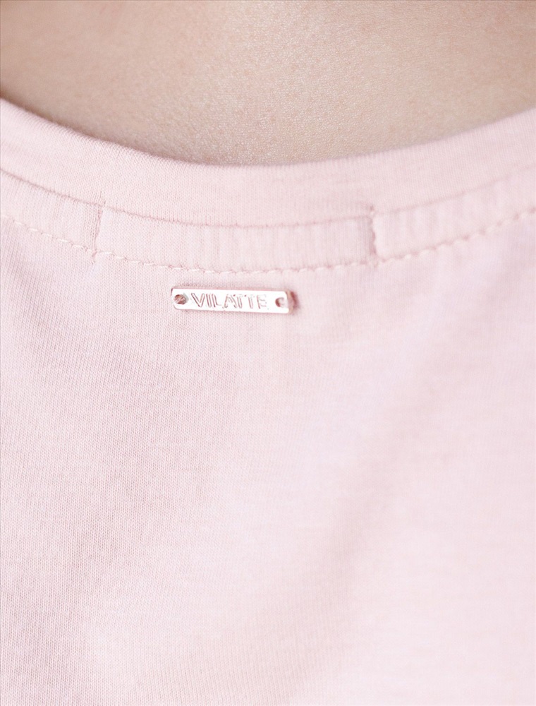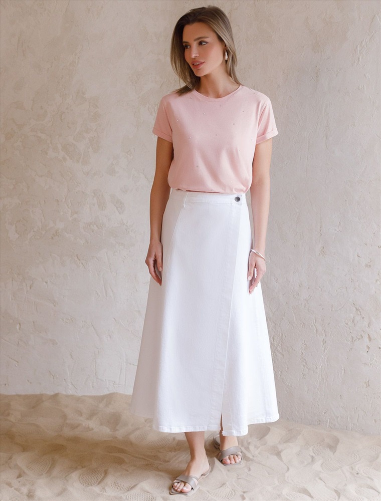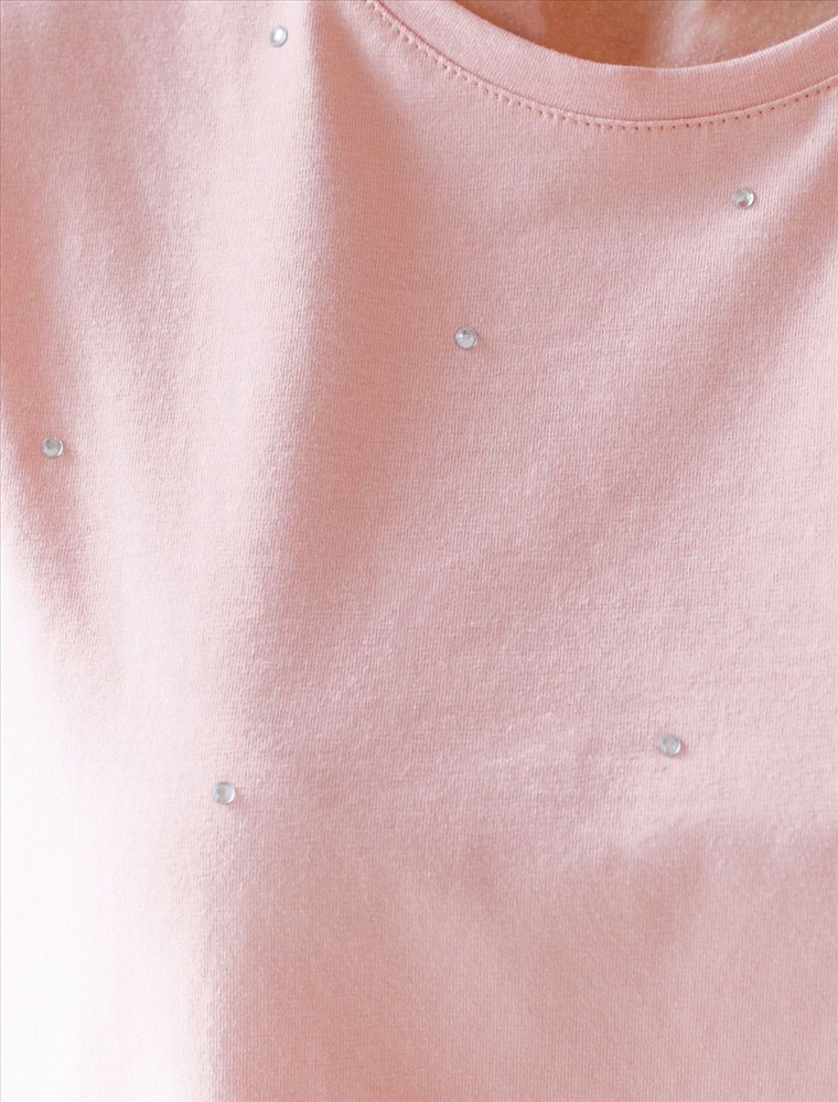 Футболка выполнена из премиального хлопка с эластаном. Лаконичный принт выполнен россыпью сияющих страз в тон изделия. Модель среднего объема дополнена подворотами на рукавах. Подходит для любого типа фигуры. Изделие дополнено металлическим логотипом бренда.