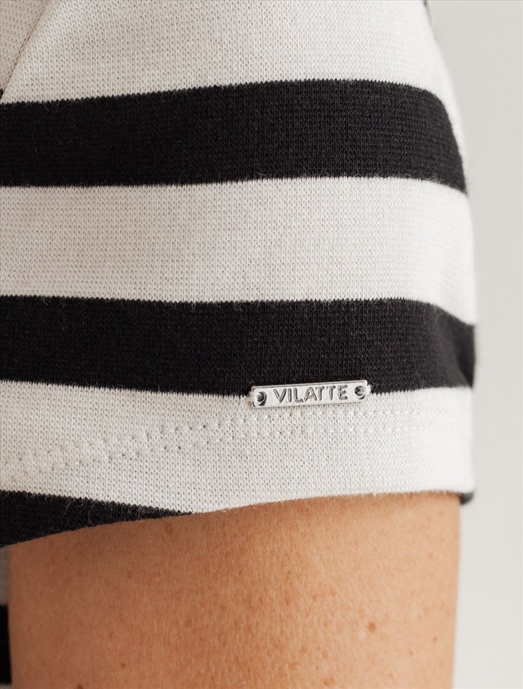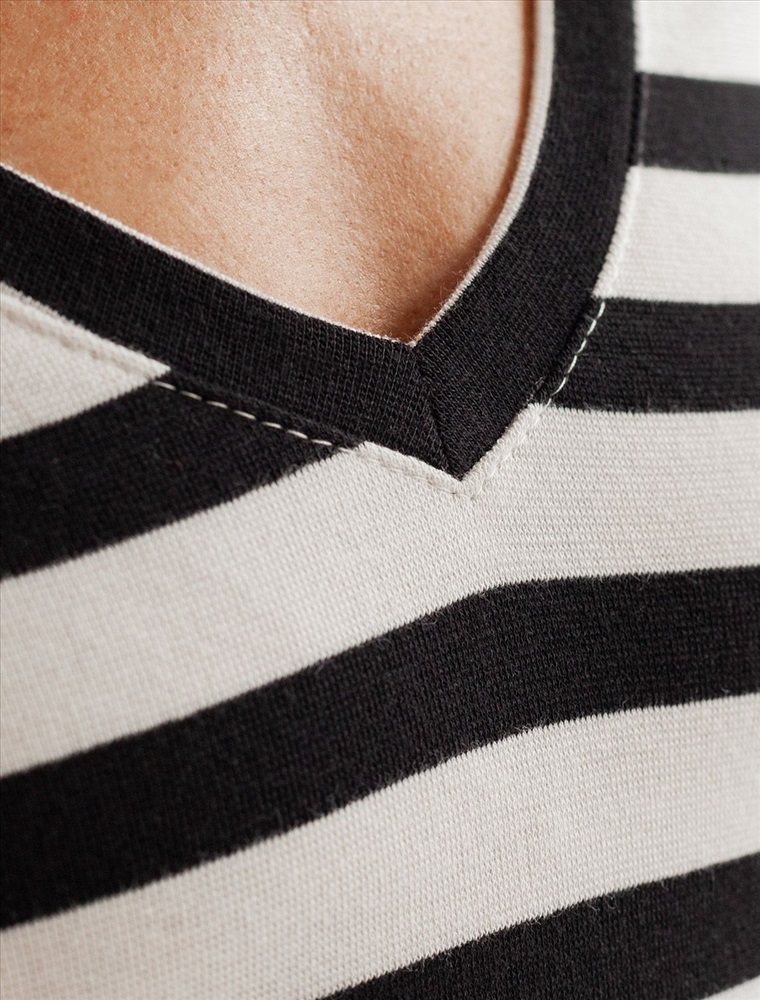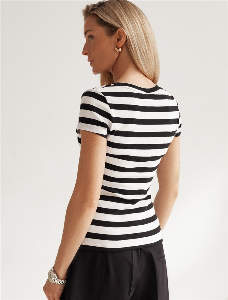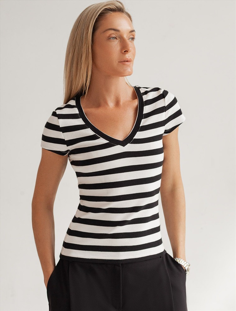 Плотность: 210 Г/м2 Облегающая футболка с V-образным вырезом в черно-белую полоску создаст утонченный образ. Идеальная базовая модель для вашего гардероба! Глубокий V-образный вырез подчеркивает линию шеи и зрительно удлиняет силуэт. Футболка выполнена из хлопка с добавлением эластана, которая мягко облегает контуры тела, подчеркивая достоинства фигуры. Универсальный вариант для создания стильных повседневных образов.