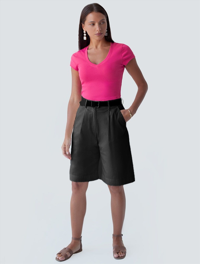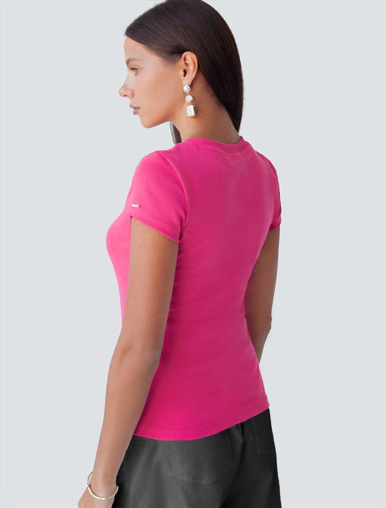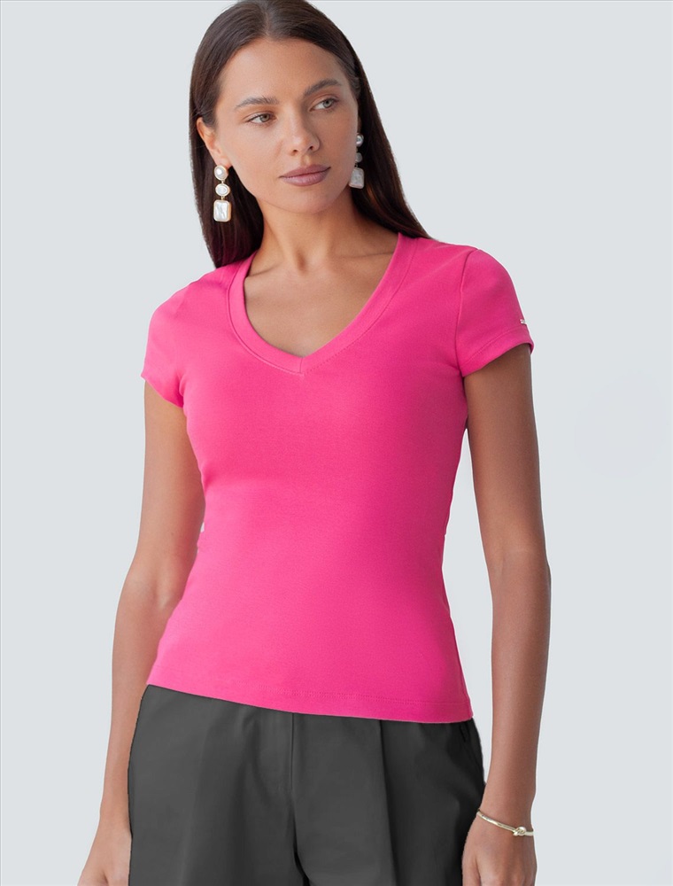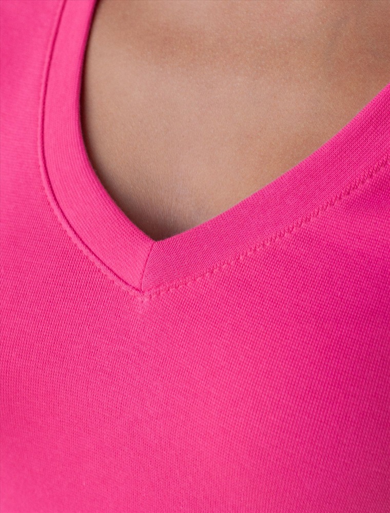 Плотность: 210 Г/м2 Облегающая футболка с V-образным вырезом цвета фуксия создаст утонченный образ. Идеальная базовая модель для вашего гардероба! Глубокий V-образный вырез подчеркивает линию шеи и зрительно удлиняет силуэт. Футболка выполнена из хлопка с добавлением эластана, которая мягко облегает контуры тела, подчеркивая достоинства фигуры. Универсальный вариант для создания стильных повседневных образов. Комментарии к товару