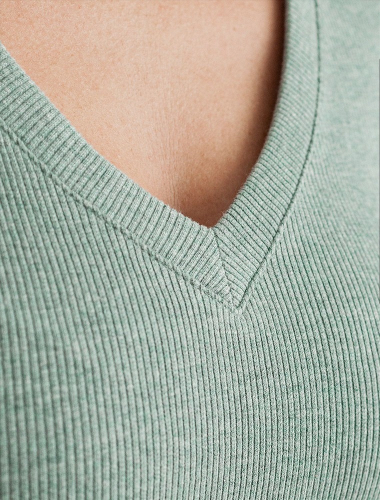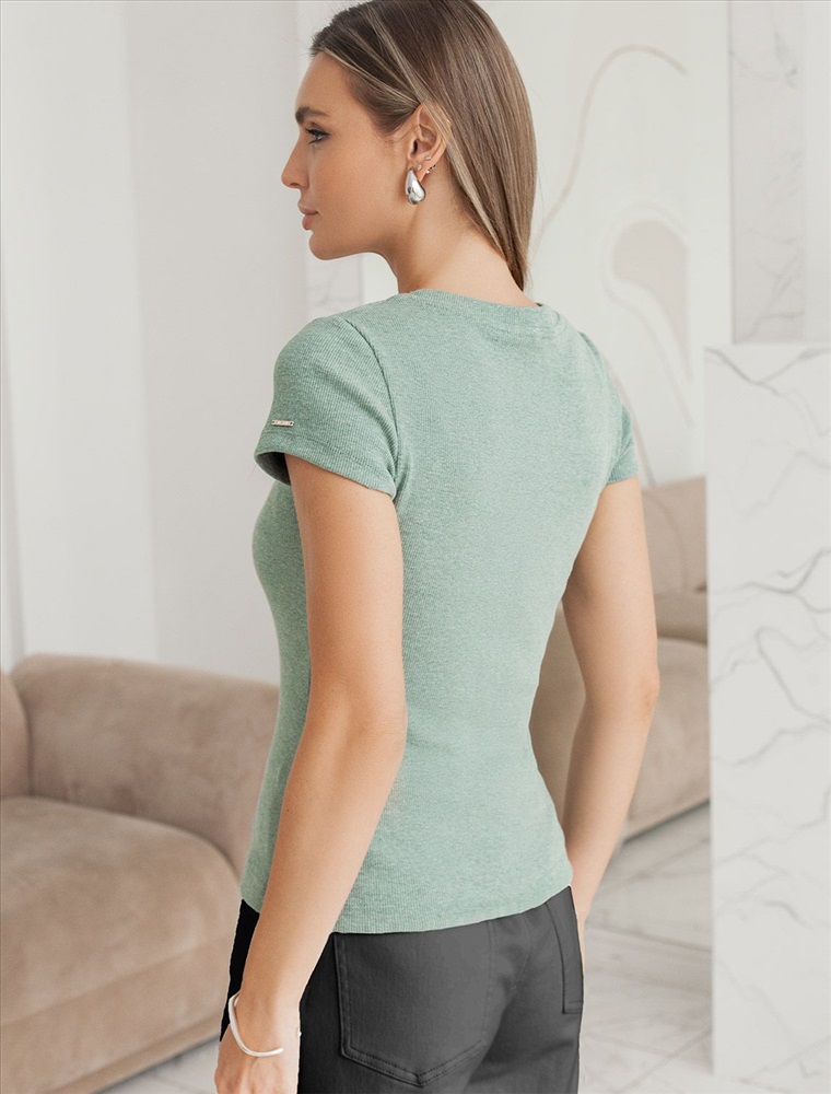 Стильная облегающая футболка кофейного цвета с V-образным вырезом сшита из плотного хлопкового трикотажа в рубчик с добавлением эластана, что гарантирует комфортную посадку по фигуре. V-вырез подчеркивает линию декольте, добавляя образу нотку элегантности. Практичная модель, которая не деформируется после стирок и сочетается с любым стилем одежды - от кэжуал до смарт-кэжуал.