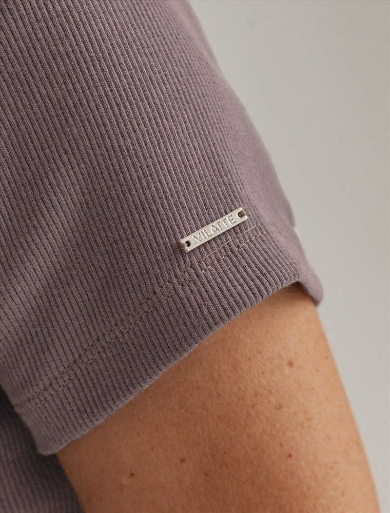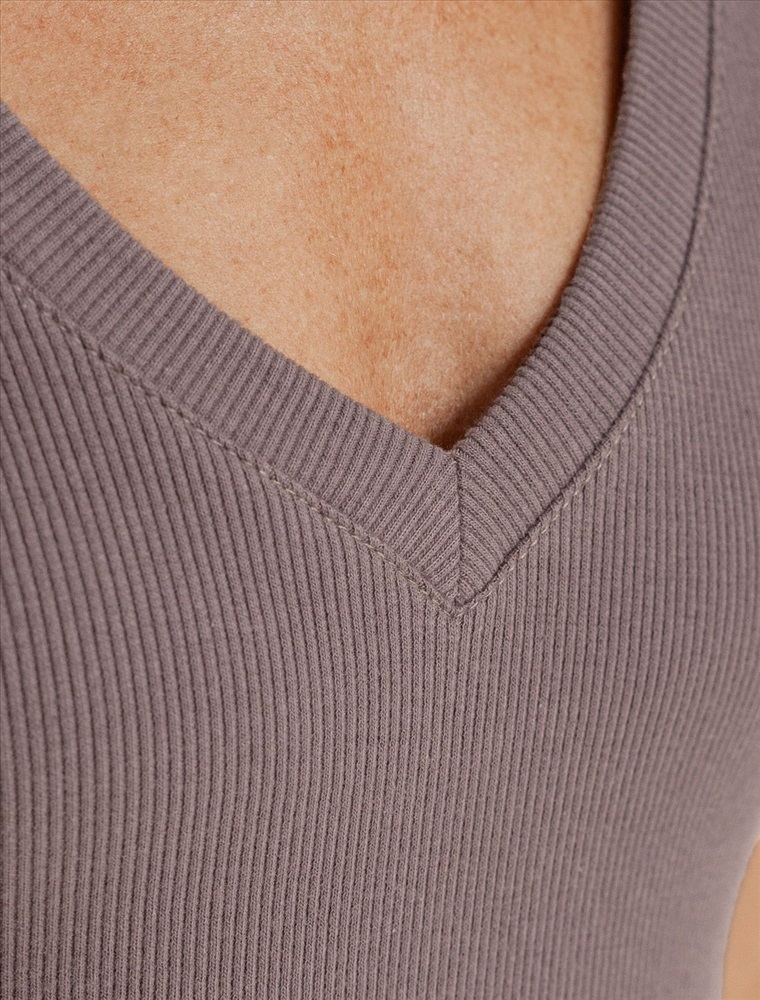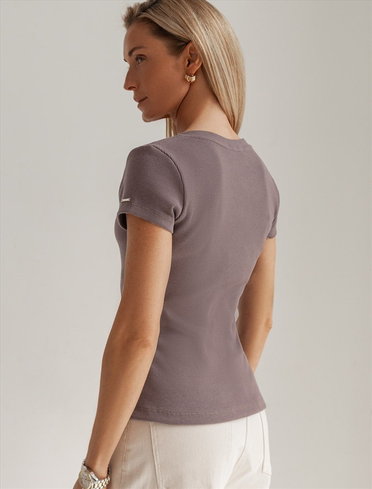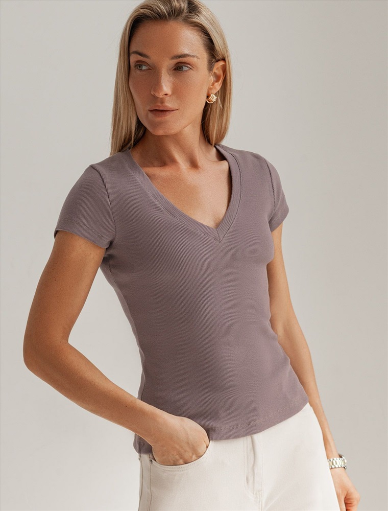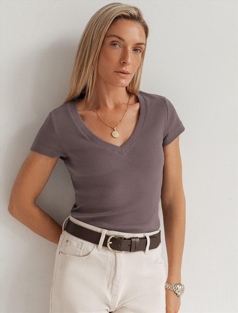 Стильная облегающая футболка кофейного цвета с V-образным вырезом сшита из плотного хлопкового трикотажа в рубчик с добавлением эластана, что гарантирует комфортную посадку по фигуре. V-вырез подчеркивает линию декольте, добавляя образу нотку элегантности. Практичная модель, которая не деформируется после стирок и сочетается с любым стилем одежды - от кэжуал до смарт-кэжуал.