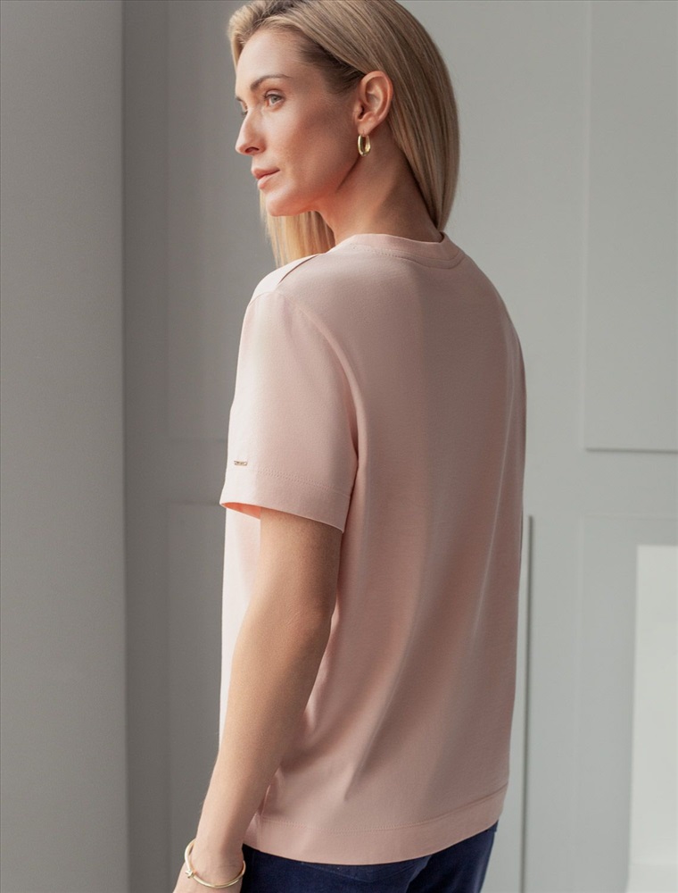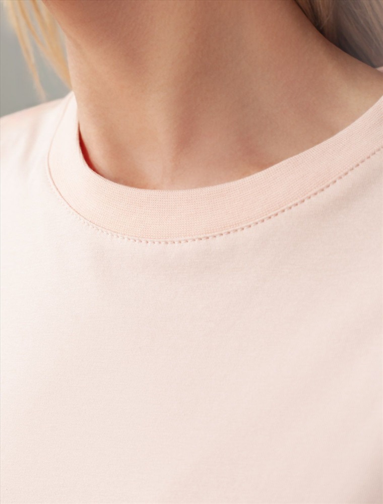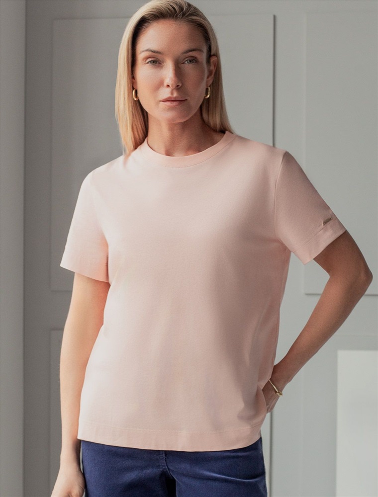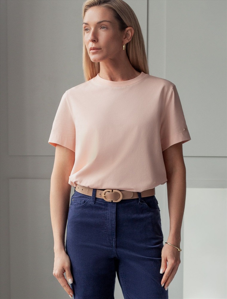 Параметры модели на первом фото: Рост 172, бюст 88, талия 64, бедра 88 Базовая однотонная футболка из премиального хлопка. Горловина выполнена из рибаны в тон изделия, Добавление эластана в состав изделия способствует формоустойчивости. Самое высокое качество хлопковых волокон обеспечивает комфорт в любое время года. Идеально держит форму и сохраняет внешний вид в течение долговременного использования. Универсальная базовая вещь для ваших стилистических решений. Изделие дополнено металлическим логотипом бренда на рукаве.