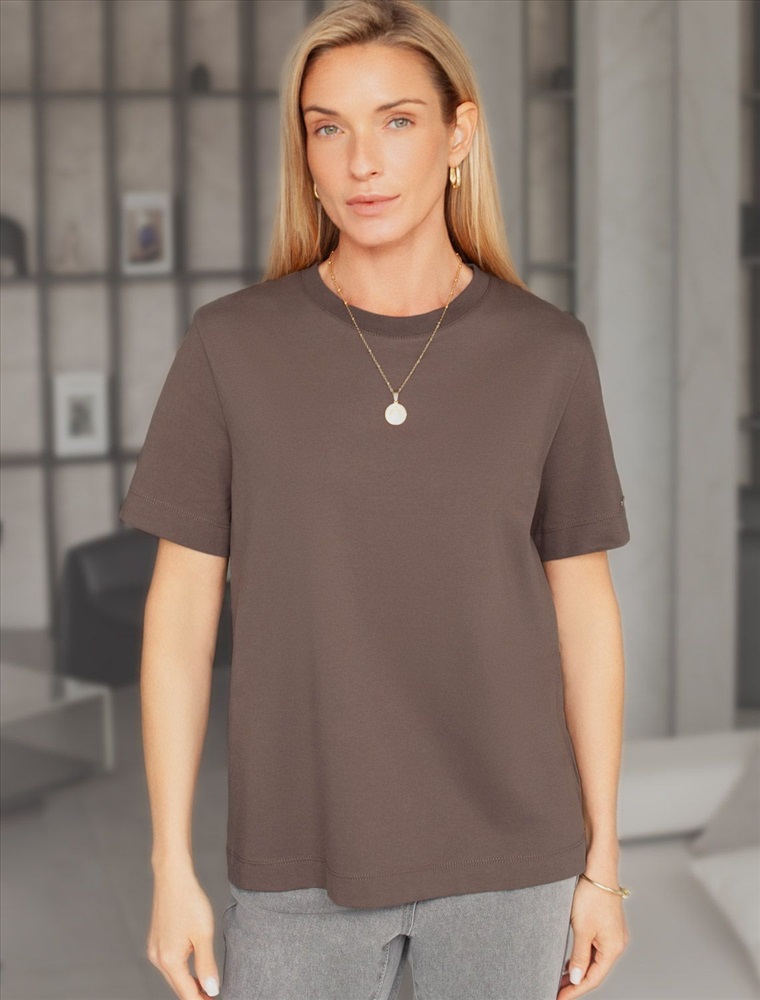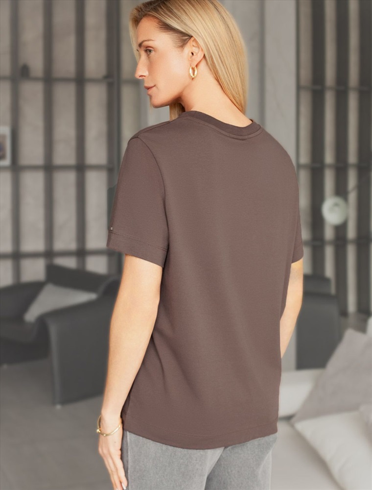 Параметры модели на первом фото: Рост 172, бюст 88, талия 64, бедра 88 Базовая однотонная футболка из премиального хлопка. Горловина выполнена из рибаны в тон изделия, Добавление эластана в состав изделия способствует формоустойчивости. Самое высокое качество хлопковых волокон обеспечивает комфорт в любое время года. Идеально держит форму и сохраняет внешний вид в течение долговременного использования. Универсальная базовая вещь для ваших стилистических решений. Изделие дополнено металлическим логотипом бренда на рукаве.