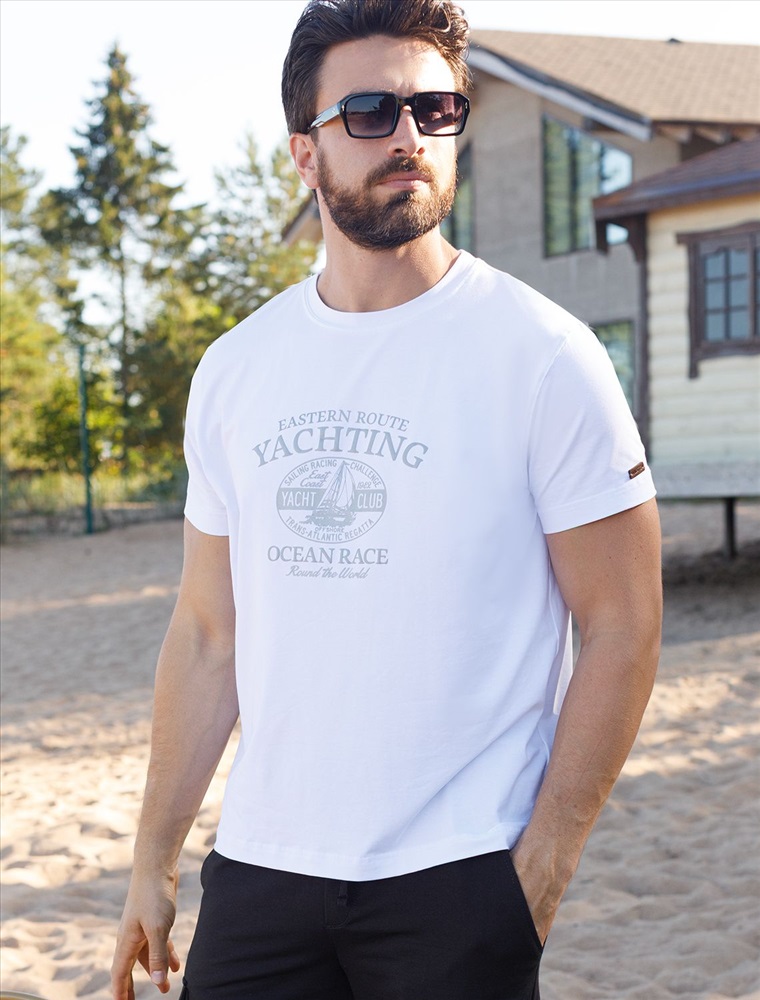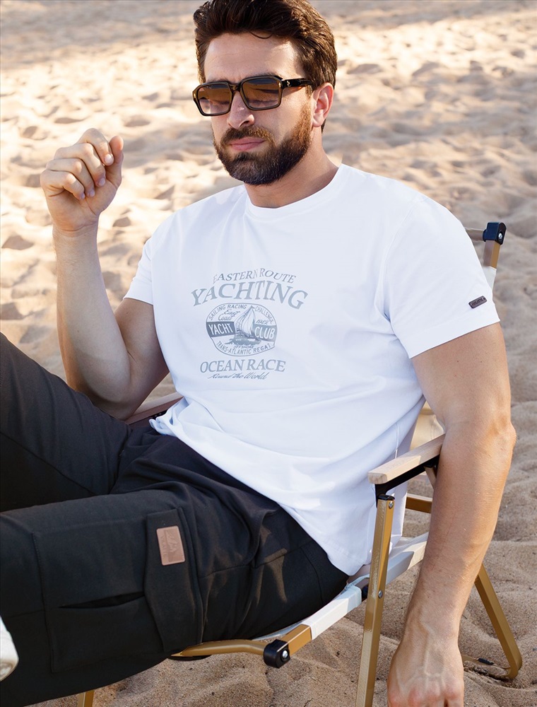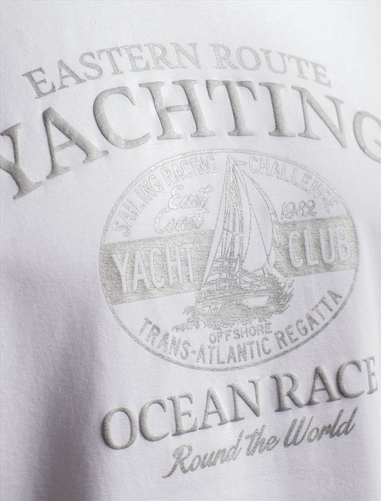 Плотность: 170 Г/м2 Параметры модели на первом фото: Рост 190, бюст 108, талия 87, бедра 104 Перевод принта: Eastern route yachting, sailing racing challenge, east coast 1982, yacht club, offshore trans atlantic regatta, ocean race, round the world - заплыв на яхте по восточному маршруту, соревнование мореплавателей, яхт-клуб, трансатлантическая регата, гонка вокруг света. Футболка выполнена из премиального хлопка с эластаном. Авторский принт нанесен фактурными красками с устойчивым покрытием. Изделие комфортно сидит по фигуре, не сковывая движений. За счет среднего объема, хорошо подойдет как первый слой под пиджак, кардиган или бомбер. На рукаве нашивка из эко-кожи с логотипом бренда. Комментарии к товару