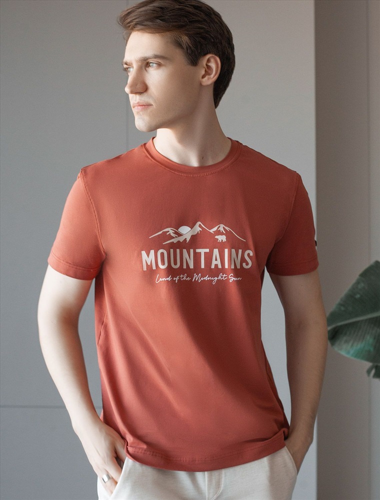 Перевод принта: Mountains, land of the midnight sun - горы - страна полуночного солнца. Футболка выполнена из премиального хлопка с эластаном. Авторский принт нанесен фактурными красками с устойчивым покрытием. Изделие комфортно сидит по фигуре, не сковывая движений. За счет среднего объема, хорошо подойдет как первый слой под пиджак, кардиган или бомбер. На рукаве нашивка из эко-кожи с логотипом бренда.