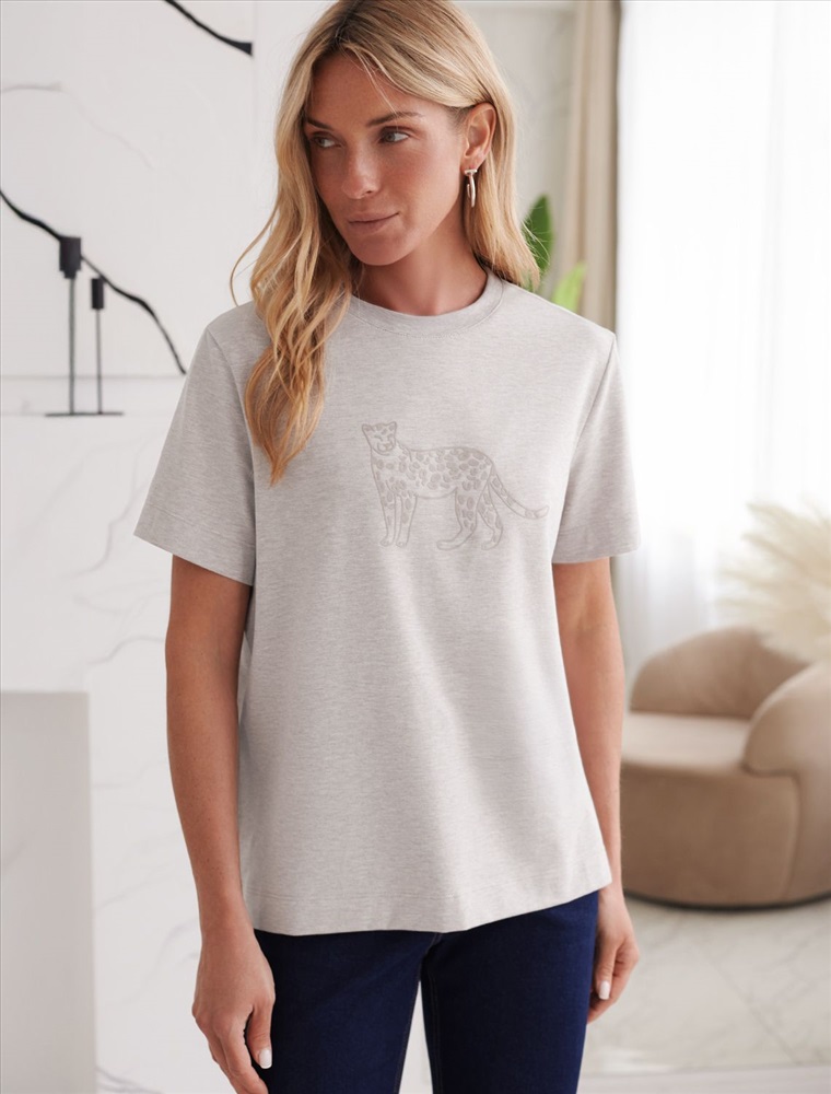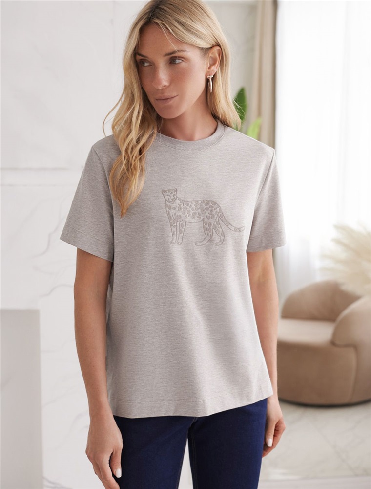 Плотность: 170 Г/м2 Футболка выполнена из премиального хлопка.Принт "леопард" нанесен фактурными красками с устойчивым покрытием. Наличие эластана в составе гарантирует комфорт и формоустойчивость. Изделие дополнено фирменным металлическим логотипом бренда. Комментарии к товару