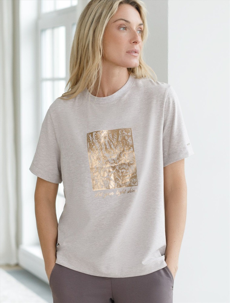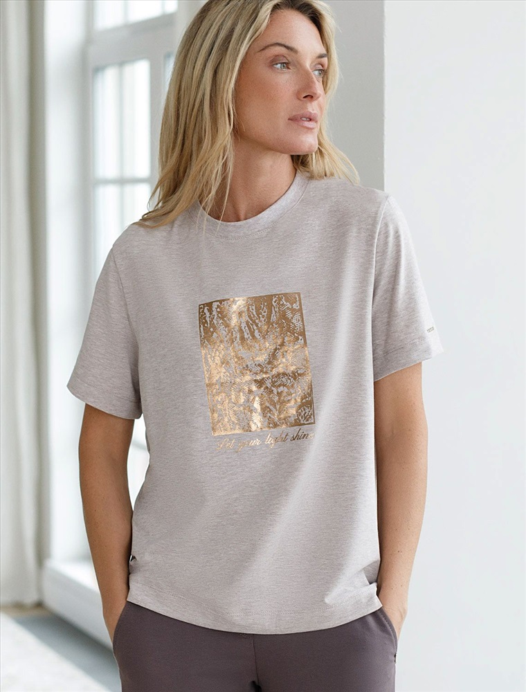 Плотность: 170 Г/м2 Перевод надписи: let your light shine — сияй. Футболка выполнена из премиального хлопка с эластаном. Эффектный фактурный принт нанесен фольгой с устойчивым покрытием, он станет дополнением не только в повседневных сочетаниях, но и отлично подойдет к вечерним образам. Изделие отлично держит форму, почти не мнется и комфортно сидит по фигуре. Отдельным украшением служит металлический логотип бренда на рукаве изделия. Комментарии к товару