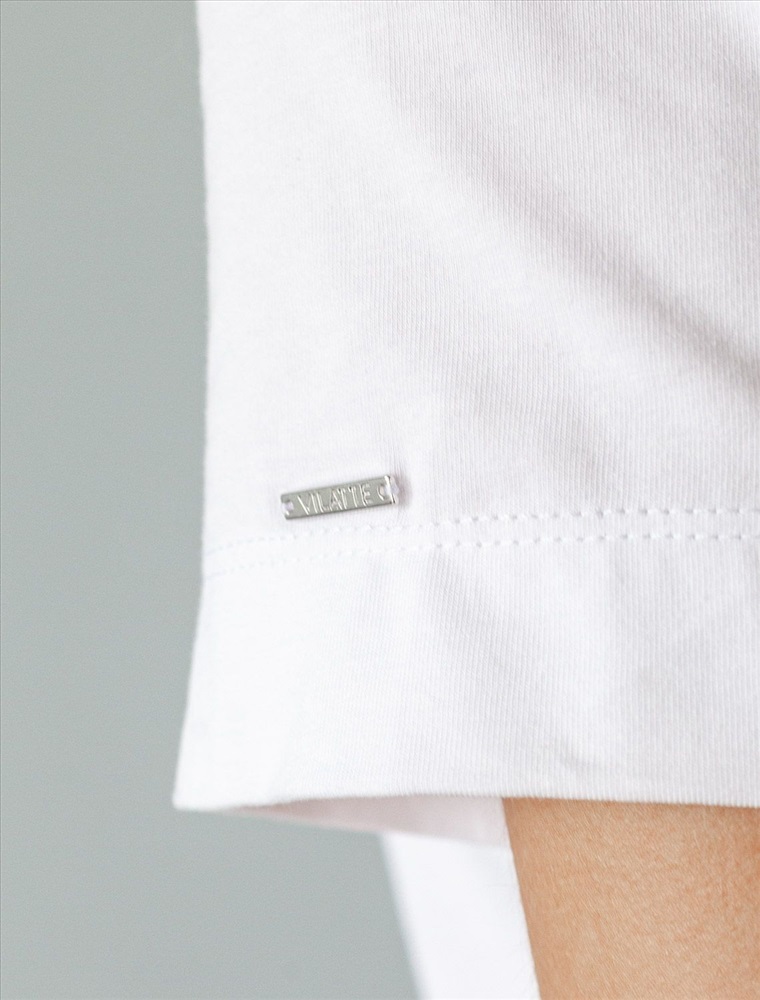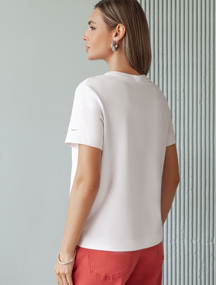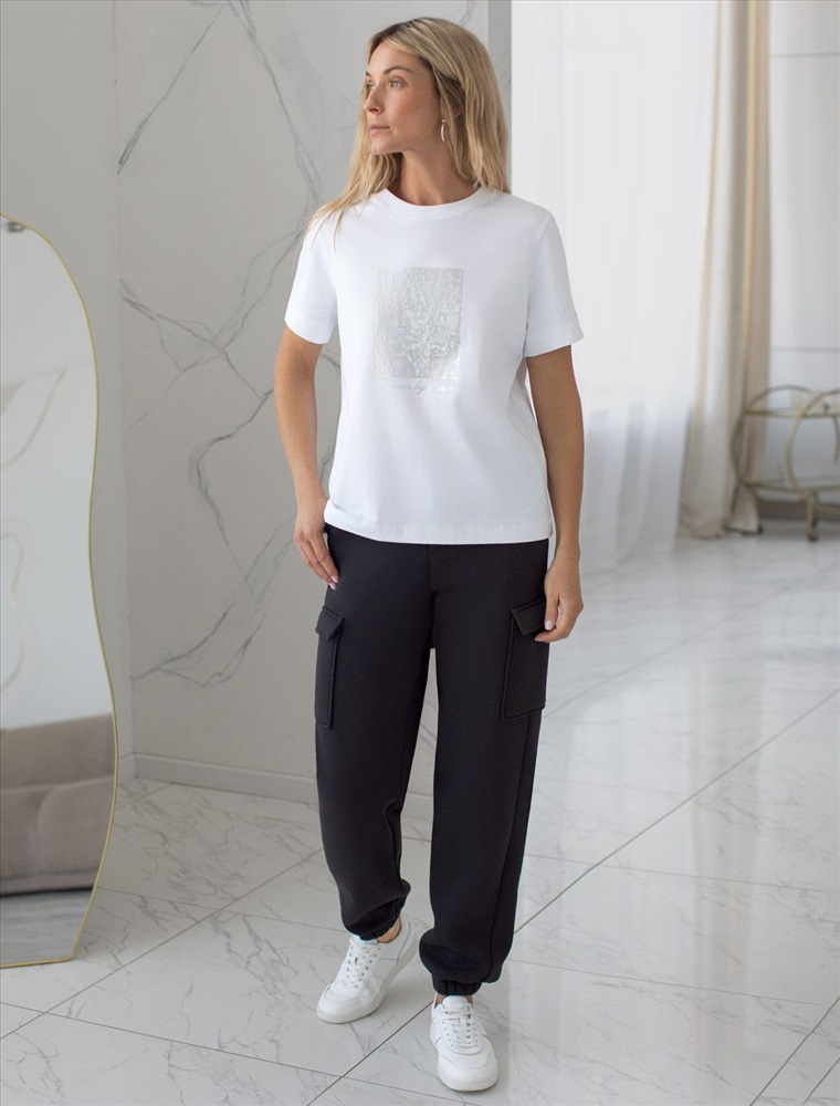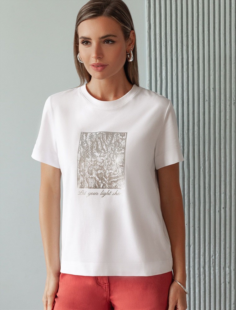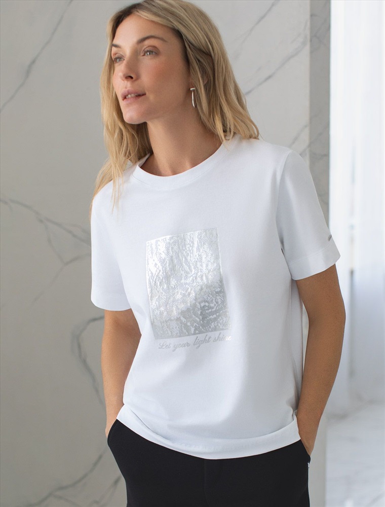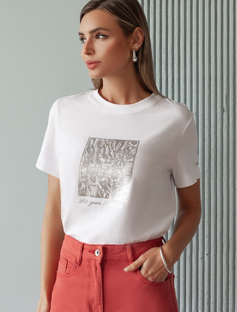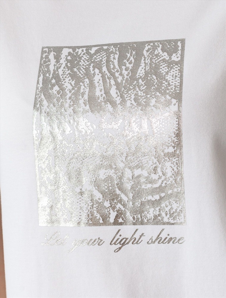Плотность: 170 Г/м2 Перевод надписи: let your light shine — сияй. Футболка выполнена из премиального хлопка с эластаном. Эффектный фактурный принт нанесен фольгой с устойчивым покрытием, он станет дополнением не только в повседневных сочетаниях, но и отлично подойдет к вечерним образам.Изделие отлично держит форму, почти не мнется и комфортно сидит по фигуре. Отдельным украшением служит металлический логотип бренда на рукаве изделия. Комментарии к товару