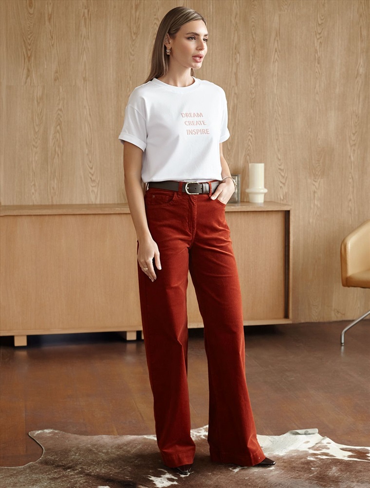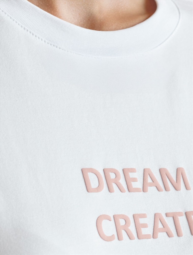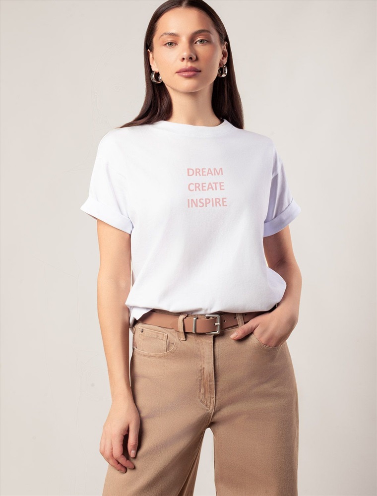 Плотность: 170 Г/м2 Параметры модели на первом фото: Рост 170, бюст 83, талия 64, бедра 88 Перевод принта: Dream, create, inspire — мечтай, создавай, вдохновляй. Футболка из премиального хлопка, высокое качество хлопковых волокон обеспечивает комфорт в любое время года. Горловина выполнена из рибаны в тон изделия, Рукава с подворотами и золотистым логотипом бренда. Авторский принт нанесен фактурными красками с устойчивым покрытием. За счет эластана в составе идеально держит форму и сохраняет внешний вид в течение долговременного использования. Универсальная вещь для ваших стилистических решений. Комментарии к товару