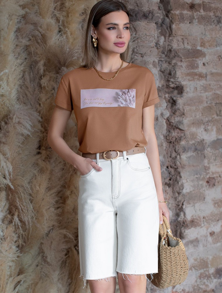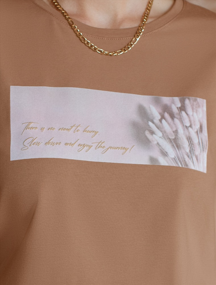 Параметры модели на первом фото: Рост 170, бюст 89, талия 63, бедра 92 Размер товара на первом фото: 42 Перевод принта: There is no need to hurry, slow down and enjoy the moment - незачем спешить, остановись и насладись моментом. Футболка выполнена из премиального хлопка с эластаном. Авторский принт нанесен красками с устойчивым покрытием. Модель среднего объема дополнена подворотами на рукавах. Легко впишется в повседневные аутфиты и добавит акцента в образы. Изделие дополнено металлическим логотипом бренда. Комментарии к товару