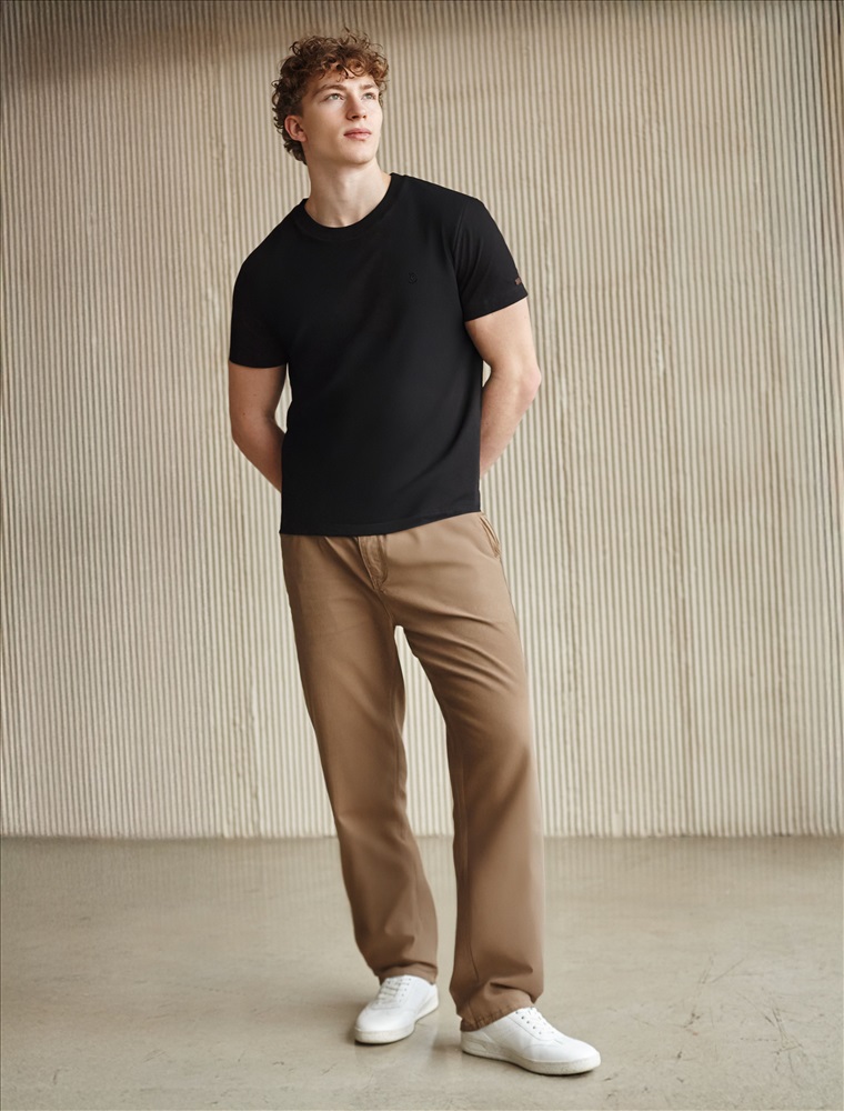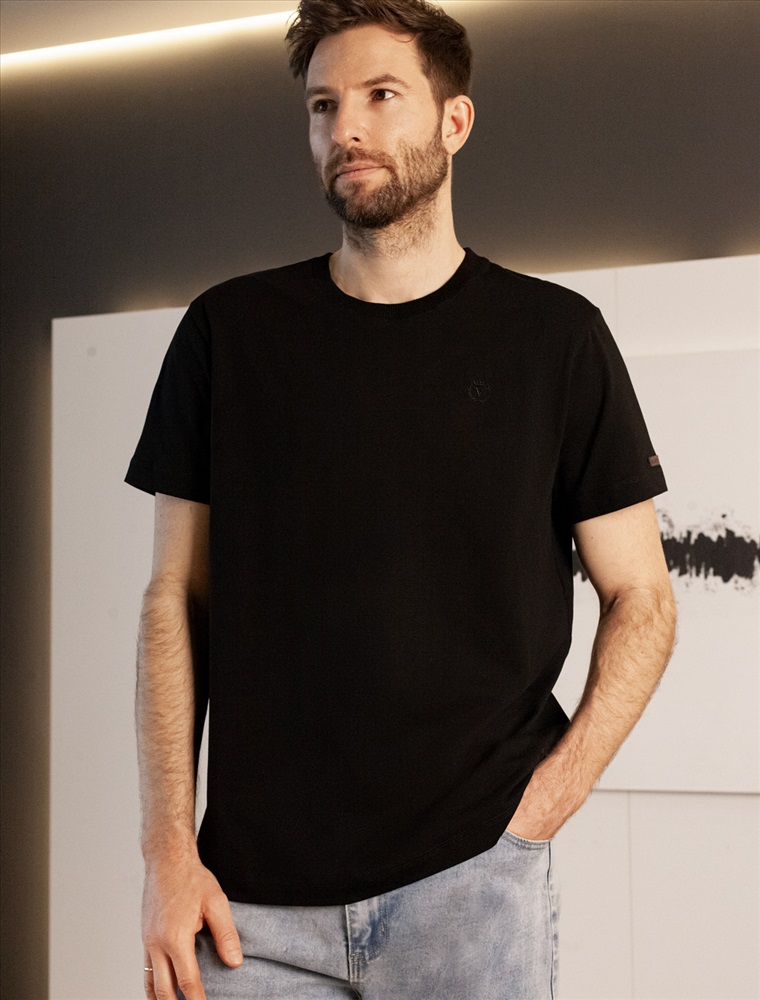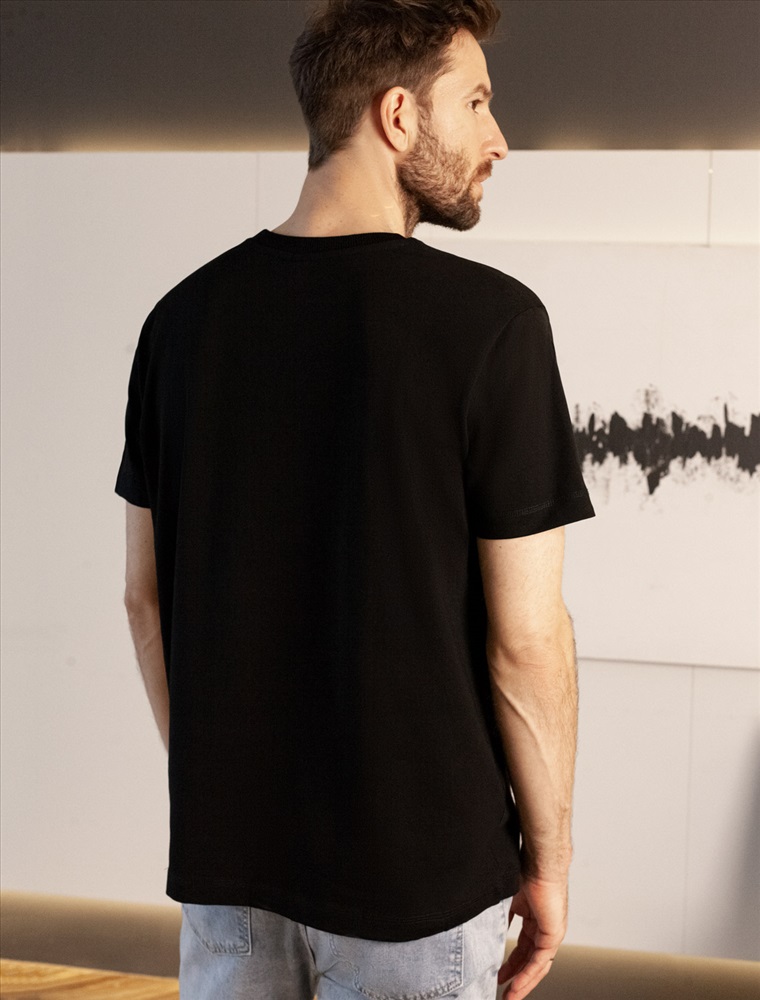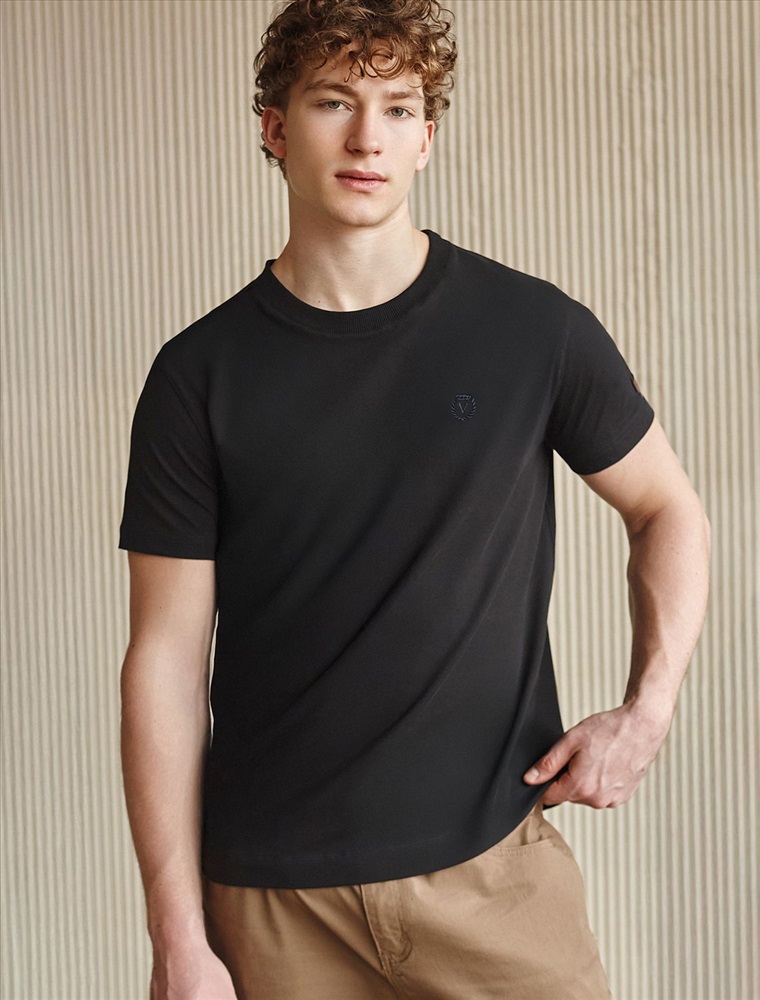 Плотность: 170 Г/м2 Параметры модели на первом фото: Рост 190, бюст 108, талия 87, бедра 104 Базовая футболка черного цвета из премиального хлопка с эластаном полуприлегающего кроя станет универсальным решением для любого случая. Прямой крой обеспечивает комфортную посадку на любую фигуру, включая большие размеры, подходит как на низкий, так и на высокий рост. Выполненная из натуральной ткани, она обладает дышащими свойствами, а за счет эластичности сохраняет форму даже после длительного ношения и многочисленных сирок. Однотонная футболка выполнена в минималистичном стиле, дополнена аккуратной вышивкой на груди в виде буквы V в тон изделия, а так нашивкой на рукаве из эко-кожи с логотипом VILATTE. Подходит как классический вариант для работы в офисе под пиджак, так и для повседневной носки или занятий спортом. Мягкая ткань приятна к телу, не вызывает дискомфорта и идеально подходит для дома или летних прогулок благодаря короткому рукаву. Простая и практичная футболка станет базовым элементом вашего гардероба. Она легко сочетается с джинсами, шортами или брюками в спортивном или классическом стиле. Стрейч-ткань поддерживает свободу движений и подчеркивает индивидуальный стиль каждого мужчины. Комментарии к товару