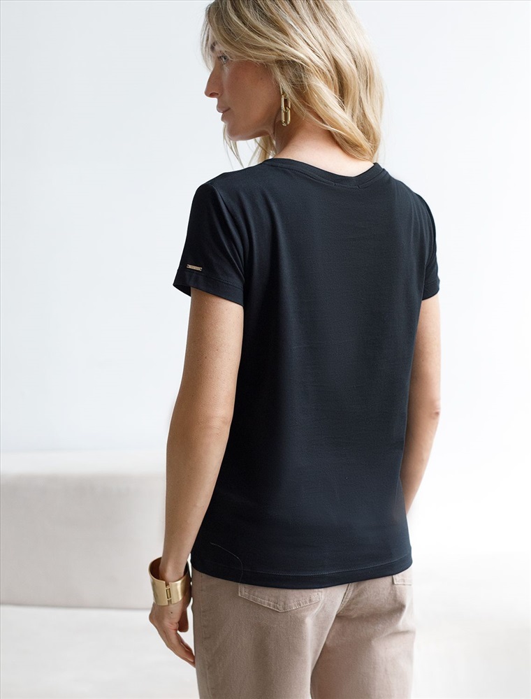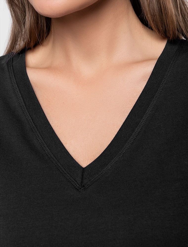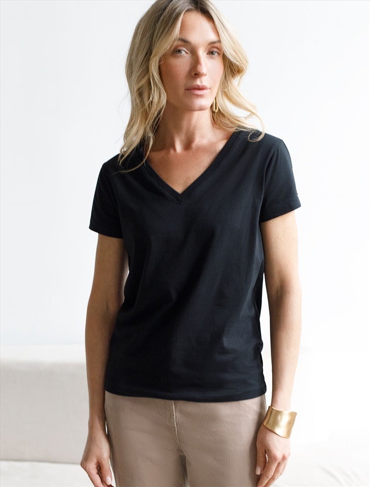 Плотность: 170 Г/м2 Параметры модели на первом фото: Рост 170, бюст 83, талия 64, бедра 88 Размер товара на первом фото: 42 Однотонная футболка с V-образным вырезом выполнена из премиального хлопка. Добавление эластана в состав изделия способствует формоустойчивости. Самое высокое качество длинноволокнистых хлопковых волокон обеспечивает комфорт в любое время года.Универсальная базовая будет уместна не только в повседневном образе с денимом, но и в офисе с нестрогим дресс-кодом, в паре с брюками и жакетом. Комментарии к товару