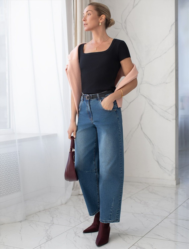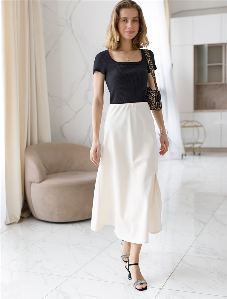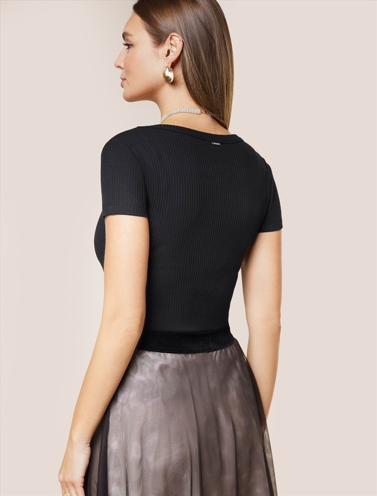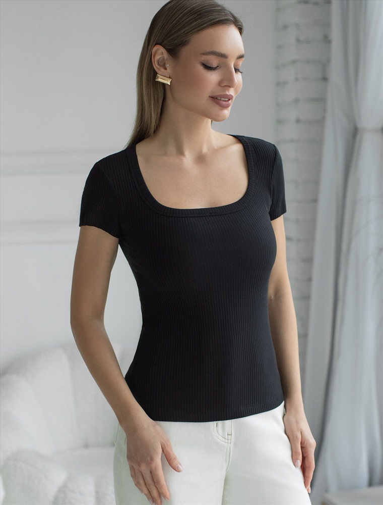 Футболка выполнена из трикотажа в широкий рубчик. Приятная к телу хлопковая ткань с гладкой трикотажной фактурой. Вырез каре подчеркивает изящество фигуры с акцентом на декольте и поддерживает силуэт. Лучшее решение для комплектов с акцентом на талию с объемными низами – палаццо, кюлотами или пышными юбками. Изделие украшено фирменным логотипом бренда.