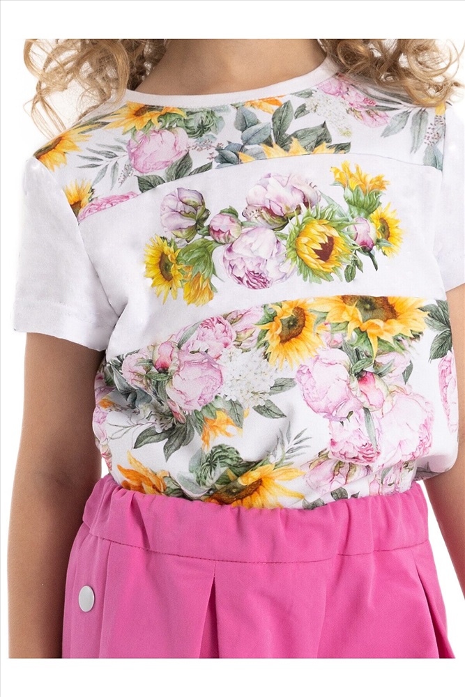 Футболка из тонкого трикотажа, короткий рукав, по горловине притачивается бейка, на полочке вставка с принтом.