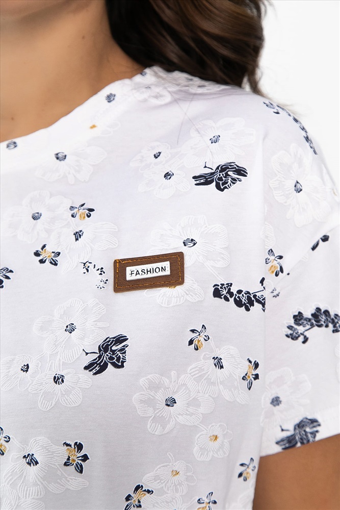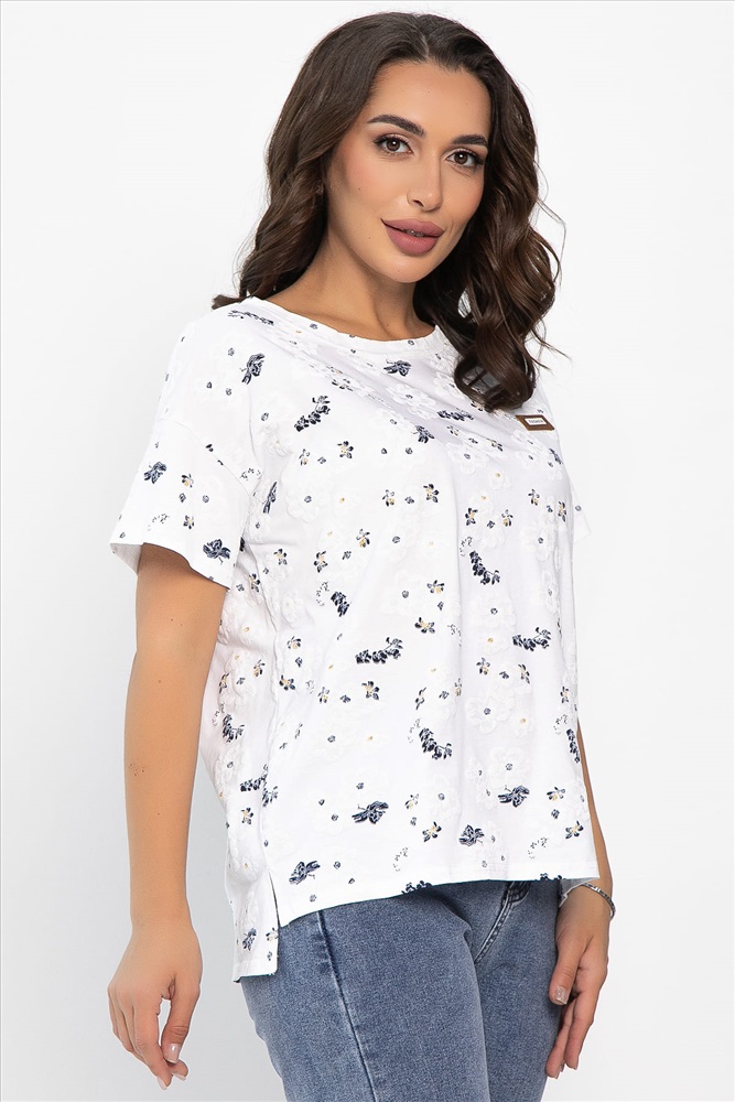 Стильная женская футболка с цветочным принтом станет настоящим украшением вашего гардероба. Она выполнена с резиновым принтом (PVC), этот вид печати передает объёмное эластичное изображение, которое может растягиваться вместе с тканью. Округлый вырез горловины и спущенные плечи придают модели легкость и непринужденность. Разница в длине передней и задней частей на 2 см добавляет образу динамику. Разрезы по бокам обеспечивают легкость и свободу движений.