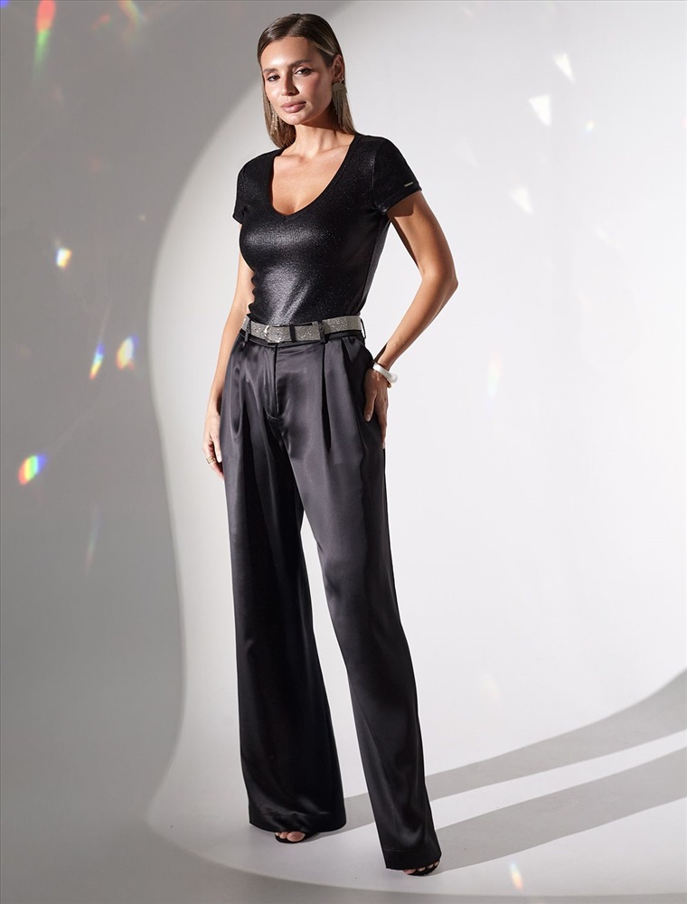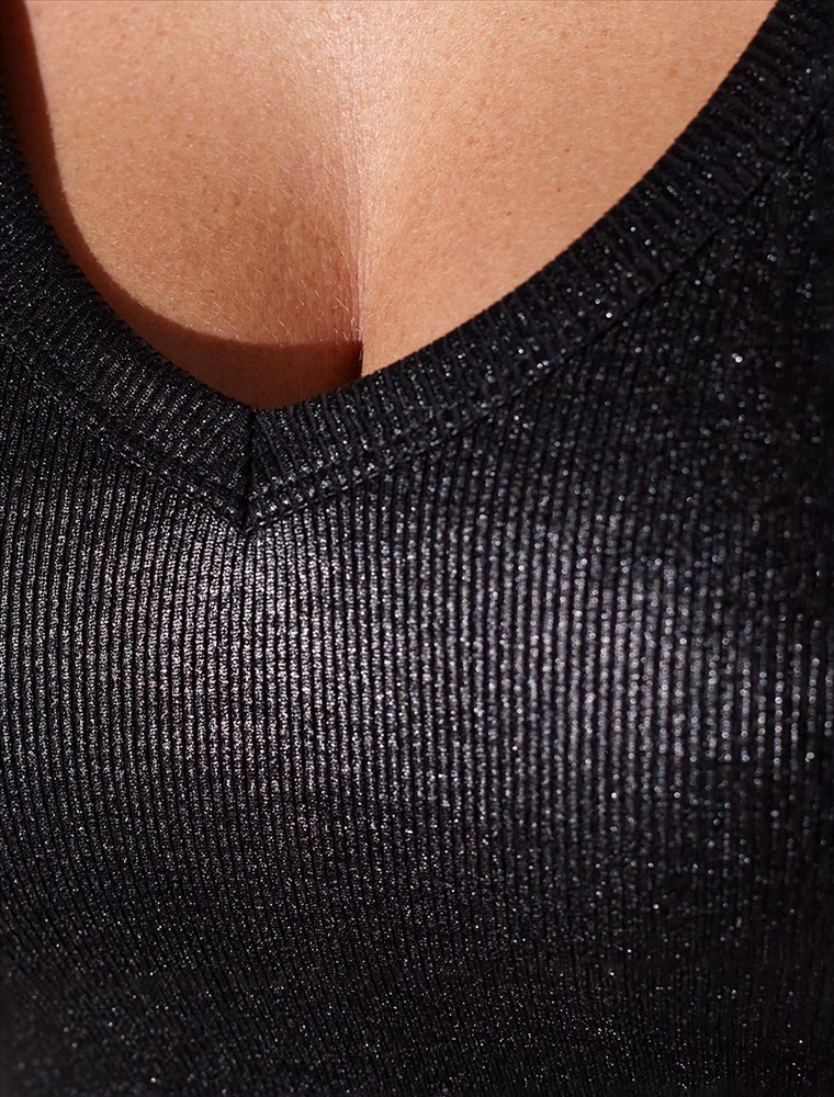 Плотность: 175 Г/м2 Стильная футболка черного цвета с V вырезом выполнена из премиального хлопка с добавлением эластана. Эффектное матовое покрытие металлик придает футболке изысканный блеск. Чуть удлиненные рукава и глубокий вырез, открывающий область декольте, добавляют женственность и элегантность образу. Мелкий рубчик визуально вытягивает силуэт, за счет эластана в составе материал прекрасно тянется и садится на любую фигуру, в том числе большие размеры. Ткань износостойкая, сохраняет свой превоначальный вид даже после многочисленных стирок, отличается мягкостью и приятными тактильными ощущениями, такой материал не раздражает кожу, дарит ощущение уюта даже при длительном ношении, а воздухопроницаемость позволяет коже свободно дышать. Повседневная футболка универсальна: она сочетается с джинсами, юбками или строгими брюками — легко создать как деловой образ для офиса, так и наряд для вечеринки или ужина вне дома. Матовое покрытие создает благородный блеск без лишней яркости, благодаря чему футболка смотрится свежо и актуально. Комментарии к товару