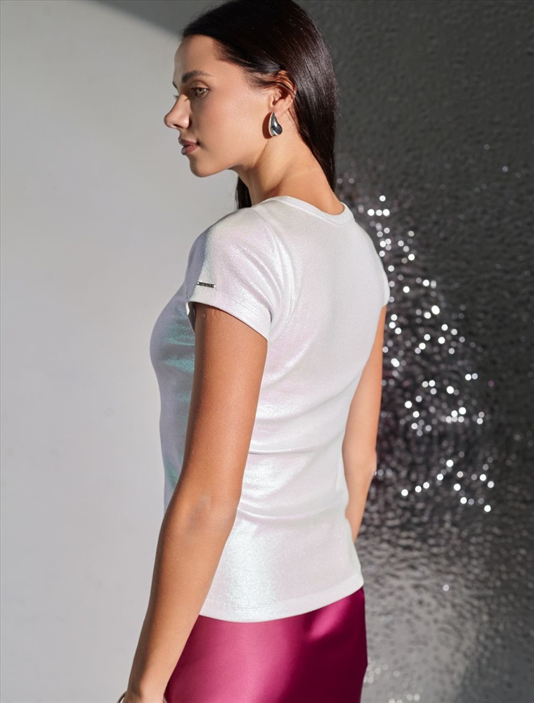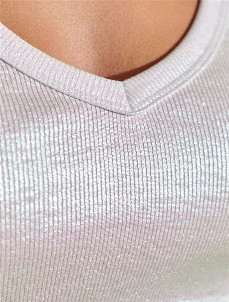 Плотность: 175 Г/м2 Стильная футболка перламутрового цвета с V вырезом выполнена из премиального хлопка с добавлением эластана. Эффектное матовое покрытие металлик придает футболке изысканный блеск. Чуть удлиненные рукава и глубокий вырез, открывающий область декольте, добавляют женственность и элегантность образу. Мелкий рубчик визуально вытягивает силуэт, за счет эластана в составе материал прекрасно тянется и садится на любую фигуру, в том числе большие размеры. Ткань износостойкая, сохраняет свой превоначальный вид даже после многочисленных стирок, отличается мягкостью и приятными тактильными ощущениями, такой материал не раздражает кожу, дарит ощущение уюта даже при длительном ношении, а воздухопроницаемость позволяет коже свободно дышать. Повседневная футболка универсальна: она сочетается с джинсами, юбками или строгими брюками — легко создать как деловой образ для офиса, так и наряд для вечеринки или ужина вне дома. Матовое покрытие создает благородный блеск без лишней яркости, благодаря чему футболка смотрится свежо и актуально. Комментарии к товару