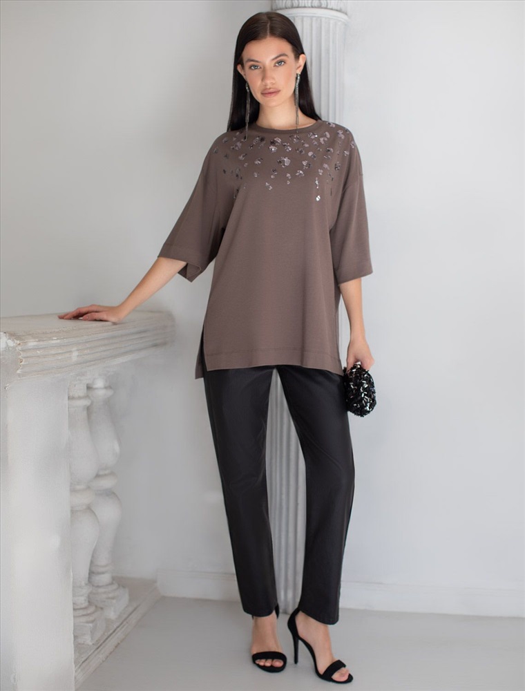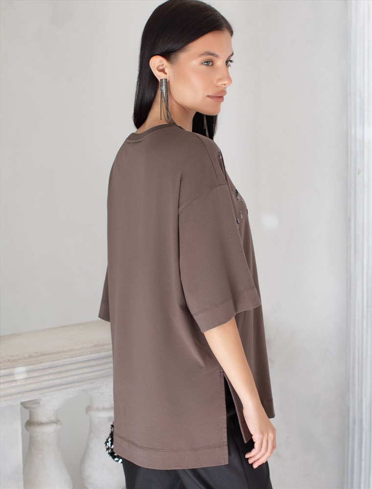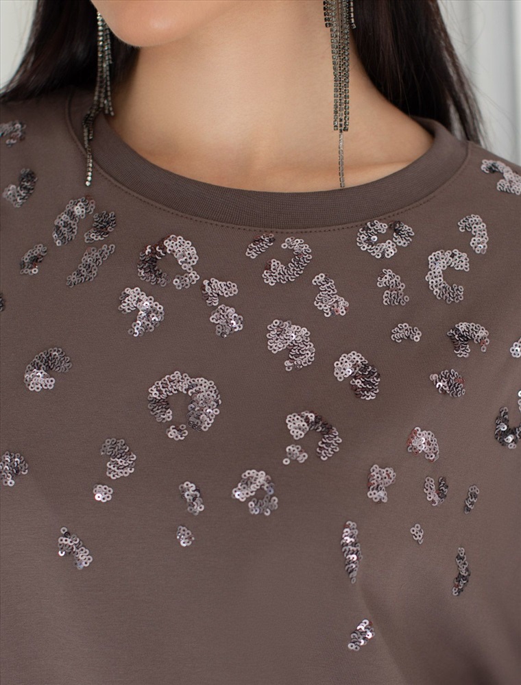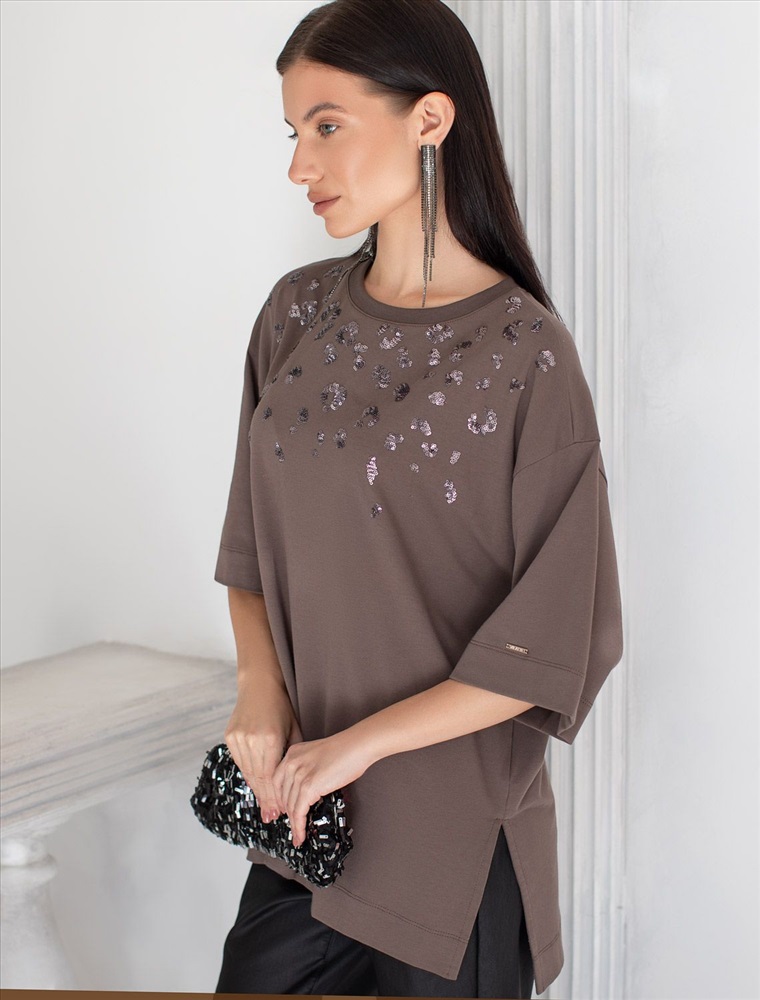 Плотность: 170 Г/м2 Оверсайз футболка кофейного цвета из премиального хлопка с добавлением эластана создана для комфорта и стиля каждый день. Натуральный материал приятный к телу, дышащая ткань хорошо держит форму и подходит для повседневной носки дома, в офисе или на прогулке. Классический свободный крой, удлиненный прямой силуэт и свободная посадка делают эту базовую футболку универсальным решением для любой фигуры и роста, включая плюс сайз размеры и беременных девушек, отлично скроет животик. Широкие рукава держат форму и подойдут на полные руки. Нарядная футболка украшена авторским принтом пайетками, которые создают красивый мерцающий эффект. Такой акцент делает модель уместной как для особых случаев, так и для ежедневных образов. Такая эффектная длинная футболка станет универсальным дополнением гардероба, позволяя создавать разнообразные образы с акцентом на современный стиль и утонченность деталей. Благодаря стильному дизайну с боковыми разрезами эта футболка станет идеальным вариантом для создания легких и непринужденных луков. Комментарии к товару