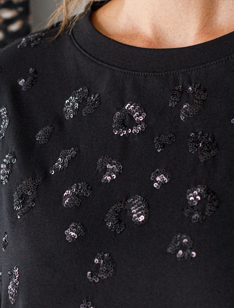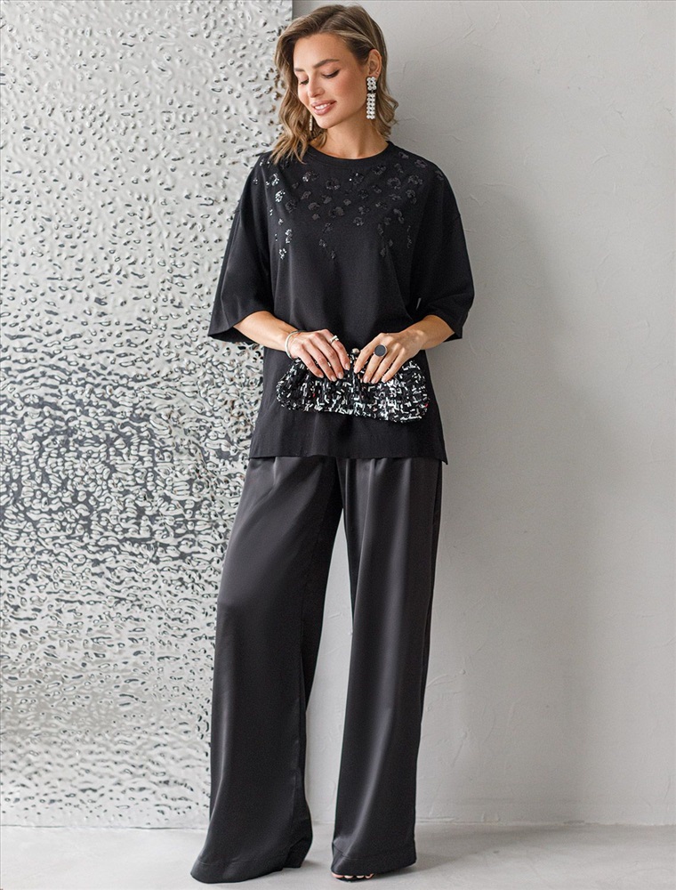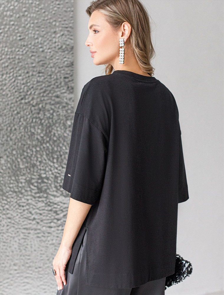 Плотность: 170 Г/м2 Оверсайз футболка черного цвета из премиального хлопка с добавлением эластана создана для комфорта и стиля каждый день. Натуральный материал приятный к телу, дышащая ткань хорошо держит форму и подходит для повседневной носки дома, в офисе или на прогулке. Классический свободный крой, удлиненный прямой силуэт и свободная посадка делают эту базовую футболку универсальным решением для любой фигуры и роста, включая плюс сайз размеры и беременных девушек, отлично скроет животик. Широкие рукава держат форму и подойдут на полные руки. Нарядная футболка украшена авторским принтом пайетками. Такой акцент делает модель уместной как для особых случаев, так и для ежедневных образов. Такая эффектная длинная футболка станет универсальным дополнением гардероба, позволяя создавать разнообразные образы с акцентом на современный стиль и утонченность деталей. Благодаря стильному дизайну с боковыми разрезами эта футболка станет идеальным вариантом для создания легких и непринужденных луков. Комментарии к товару