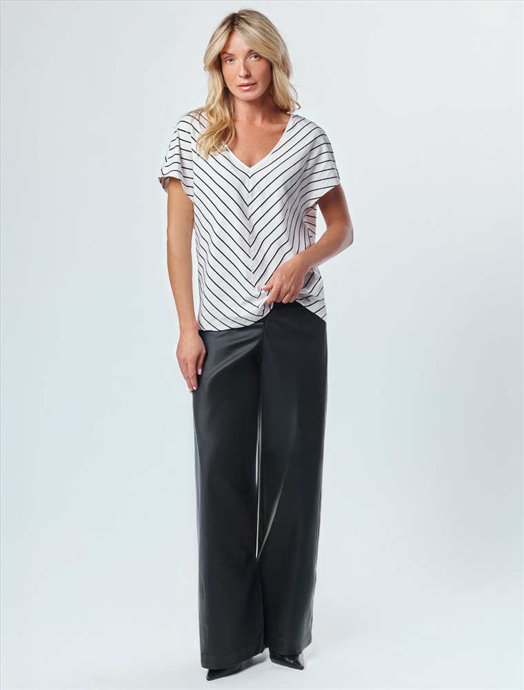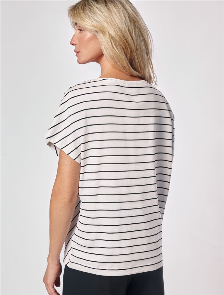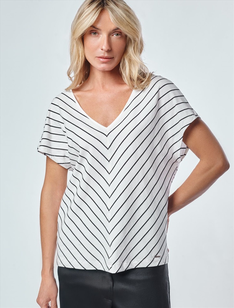 Футболка выполнена из эластичного хлопка. Модель с цельнокроеным рукавом и V-вырезом, который подчеркивают геометрично соединенные полосы. В отличии от классической горизонтальной полоски, такой орнамент стройнит и вытягивает силуэт. Изделие дополнено металлическим логотипом бренда.