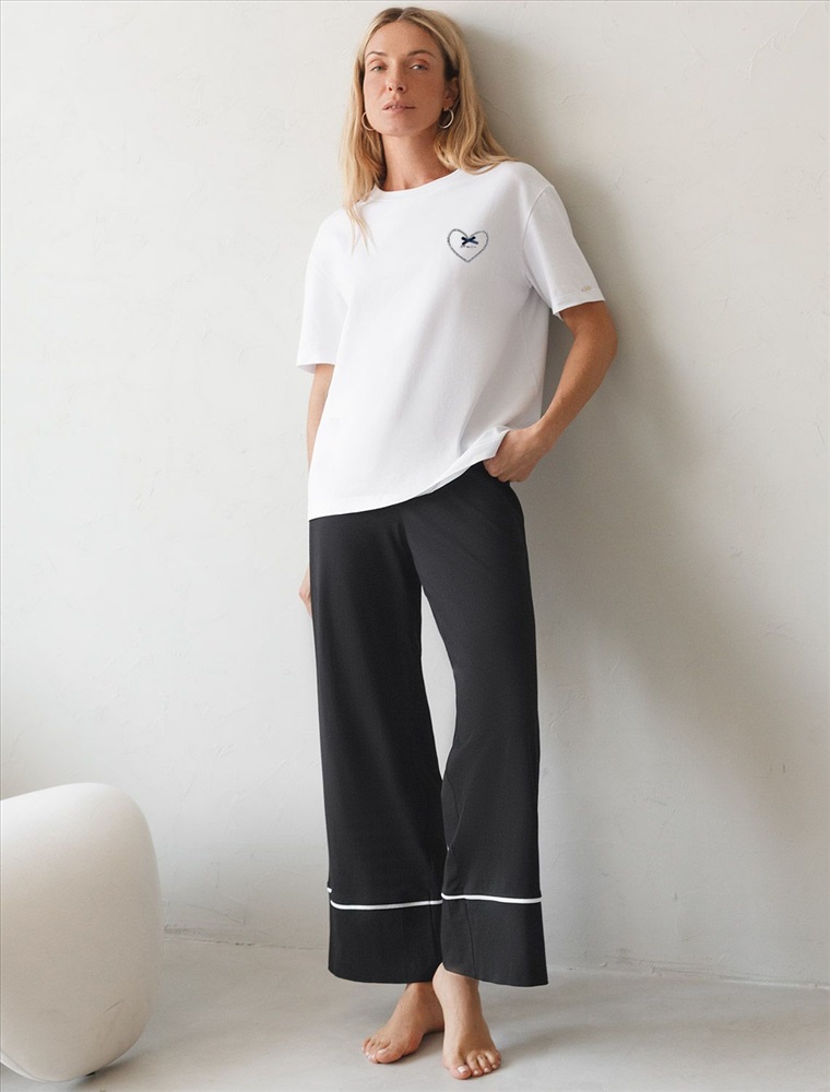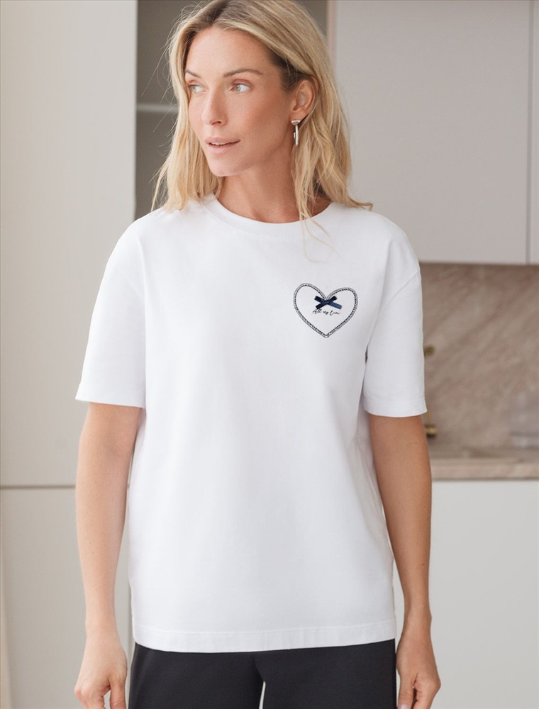 Плотность: 170 Г/м2 Размер товара на первом фото: 42 Футболка белого цвета изготовлена из премиального хлопка с эластаном, она обеспечивает невероятное ощущение уюта и легкости. Натуральный материал сохраняет форму и цвет после множества стирок, обеспечивая долговечность изделия, а его высокая воздухопроницаемость создает ощущение свежести даже в течение долгого дня. Особое внимание привлекает стильный принт в виде сердца с минималистичной надписью, перевод надписи All my love - вся моя любовь. Принт выполненны красками с устойчивым покрытием, который добавляет изделию оригинальности и позволяет выразить индивидуальность. Свободный крой футболки дарит удобство и не стесняет движений, что делает ее идеальной для повседневной носки или активного отдыха, подчеркивает современный взгляд на моду. На рукаве металлический логотип бренда. Подойдет девушкам и женщинам на любую фигуру, вы будете чувствовать себя в ней уверенно и комфортно. Отлично впишется в гардероб благодаря универсальному дизайну, который легко сочетать с джинсами, шортами или спортивными брюками. Комментарии к товару