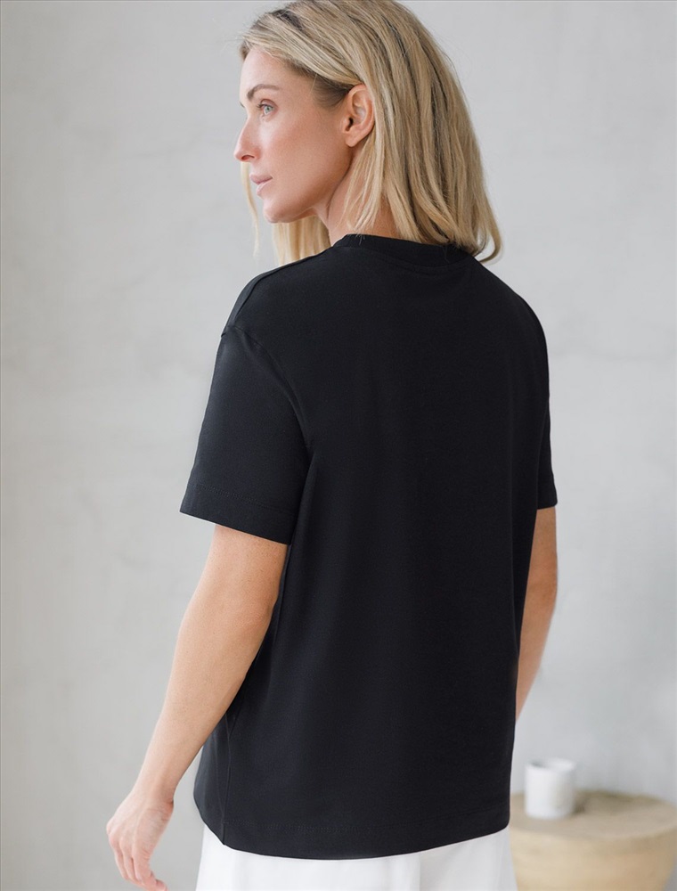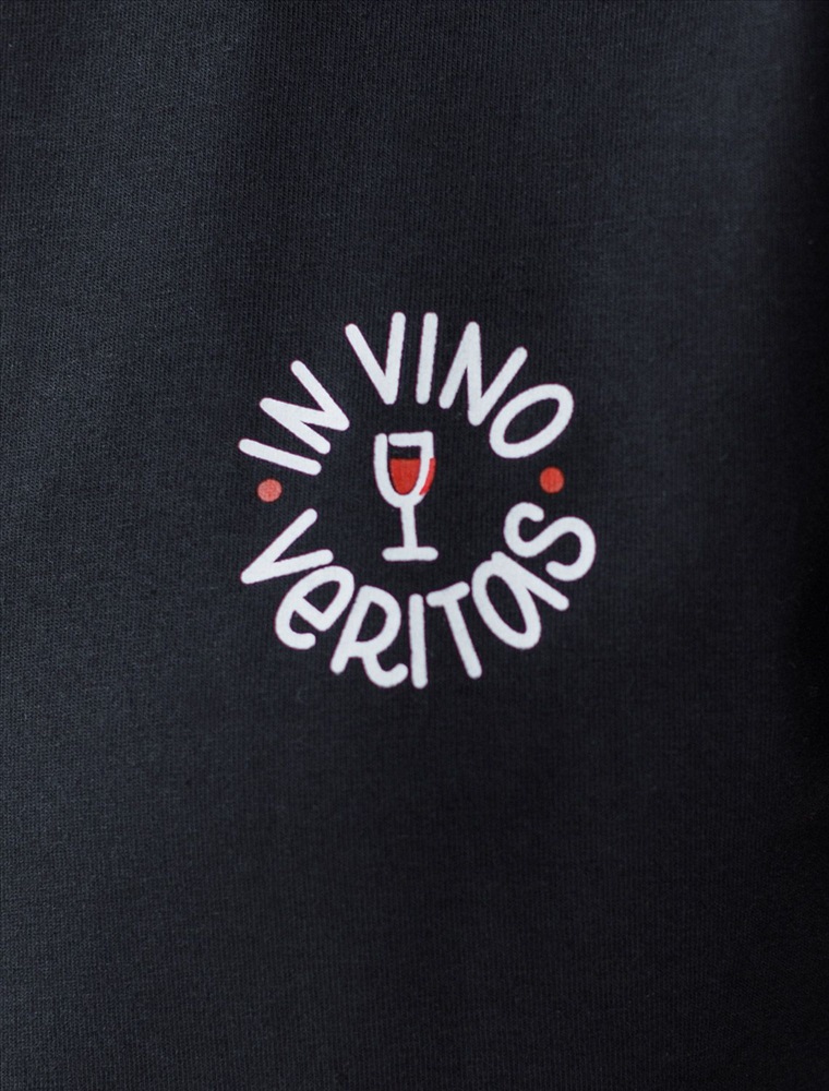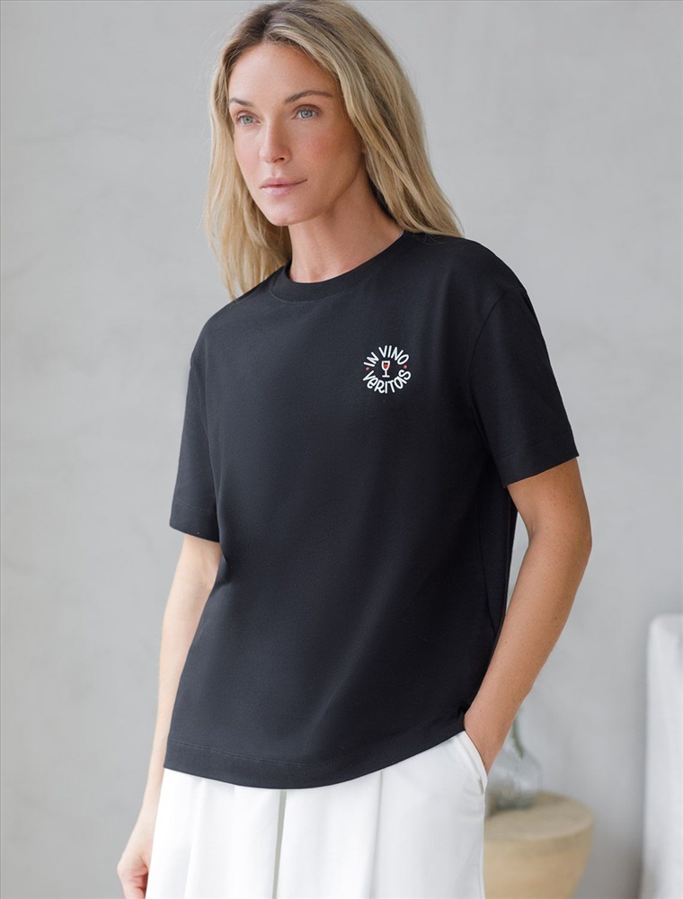 Плотность: 170 Г/м2 Размер товара на первом фото: 42 Футболка черного цвета изготовлена из премиального хлопка с эластаном, она обеспечивает невероятное ощущение уюта и легкости. Натуральный материал сохраняет форму и цвет после множества стирок, обеспечивая долговечность изделия, а его высокая воздухопроницаемость создает ощущение свежести даже в течение долгого дня. Особое внимание привлекает стильный принт в виде бокала с минималистичной надписью. Перевод надписи: In vino veritas - Приходит вино - уходит истина. Принт выполнен красками с устойчивым покрытием, который добавляет изделию оригинальности и позволяет выразить индивидуальность. Свободный крой футболки дарит удобство и не стесняет движений, что делает ее идеальной для повседневной носки или активного отдыха, подчеркивает современный взгляд на моду. На рукаве металлический логотип бренда. Подойдет девушкам и женщинам на любую фигуру, вы будете чувствовать себя в ней уверенно и комфортно. Отлично впишется в гардероб благодаря универсальному дизайну, который легко сочетать с джинсами, шортами или спортивными брюками. Комментарии к товару