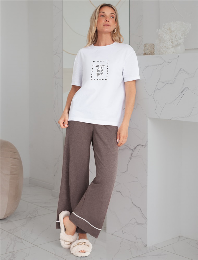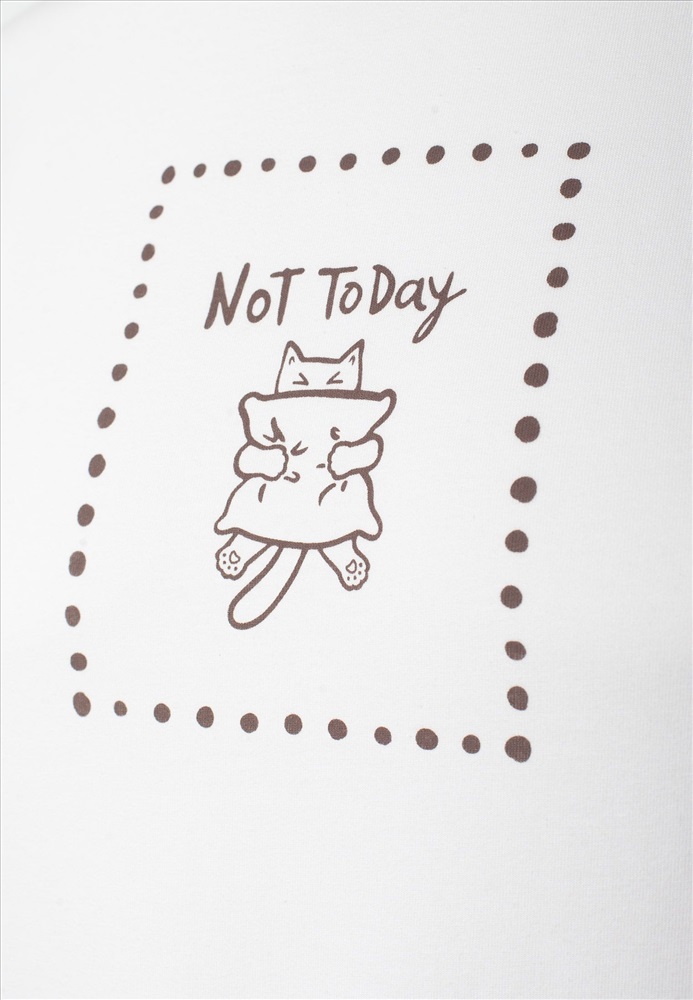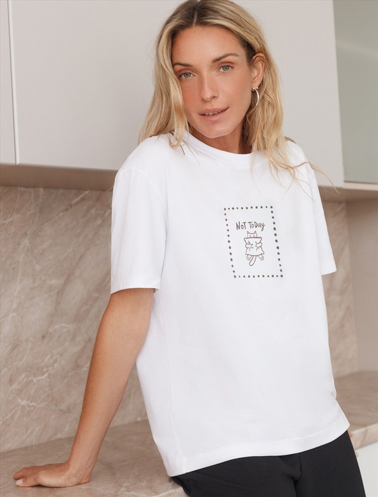 Плотность: 170 Г/м2 Размер товара на первом фото: 42 Футболка белого цвета изготовлена из премиального хлопка с эластаном, она обеспечивает невероятное ощущение уюта и легкости. Натуральный материал сохраняет форму и цвет после множества стирок, обеспечивая долговечность изделия, а его высокая воздухопроницаемость создает ощущение свежести даже в течение долгого дня. Особое внимание привлекает стильный принт в виде милого котика с минималистичной надписью. Перевод надписи Not today - Не сегодня. Принт выполнен красками с устойчивым покрытием, который добавляет изделию оригинальности и позволяет выразить индивидуальность. Свободный крой футболки дарит удобство и не стесняет движений, что делает ее идеальной для повседневной носки или активного отдыха, подчеркивает современный взгляд на моду. На рукаве металлический логотип бренда. Подойдет девушкам и женщинам на любую фигуру, вы будете чувствовать себя в ней уверенно и комфортно. Отлично впишется в гардероб благодаря универсальному дизайну, который легко сочетать с джинсами, шортами или спортивными брюками. Комментарии к товару