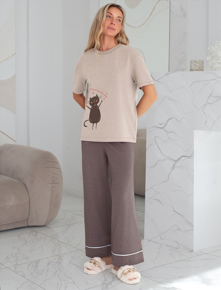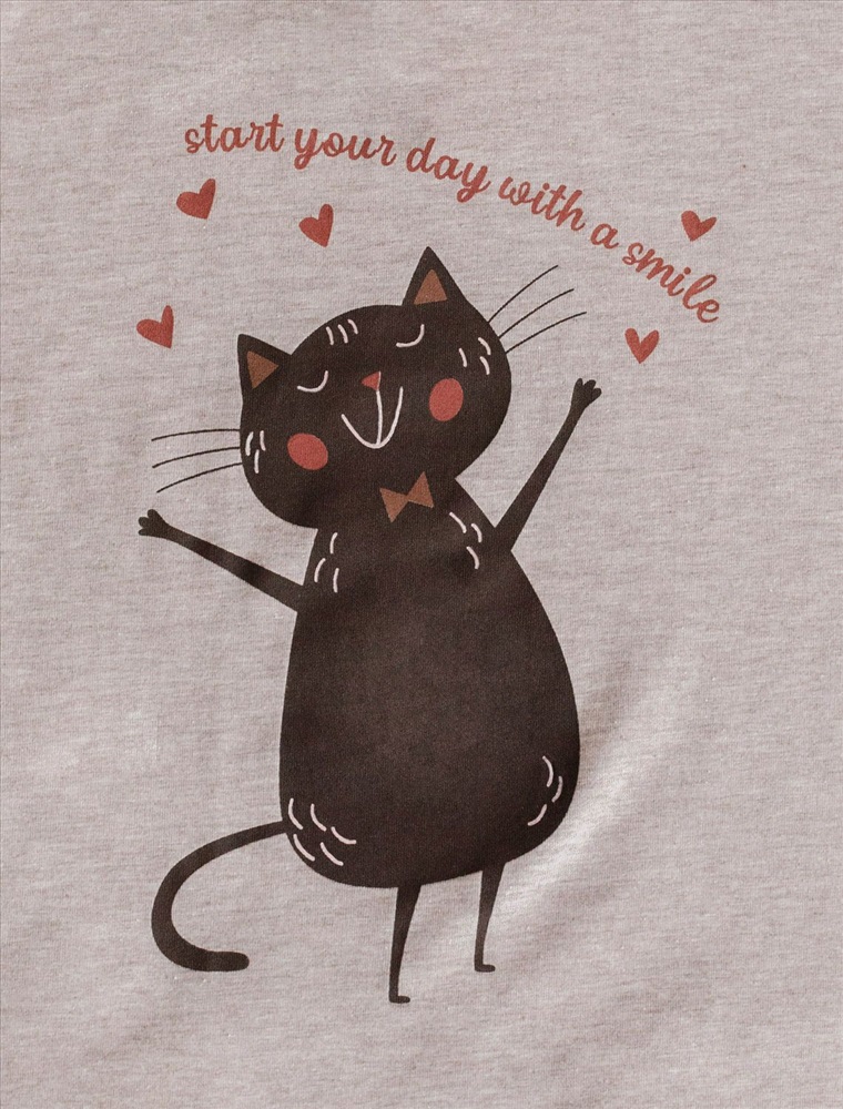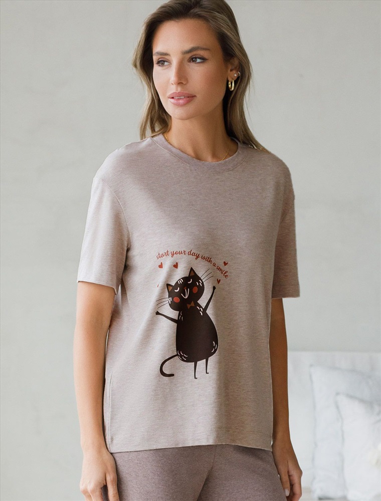 Плотность: 170 Г/м2 Размер товара на первом фото: 42 Футболка кофейного цвета изготовлена из премиального хлопка с эластаном, она обеспечивает невероятное ощущение уюта и легкости. Натуральный материал сохраняет форму и цвет после множества стирок, обеспечивая долговечность изделия, а его высокая воздухопроницаемость создает ощущение свежести даже в течение долгого дня. Особое внимание привлекает стильный принт в виде кота и сердечек с минималистичной надписью. Перевод надписи Start your day with a smile - Начни свой день с улыбки. Принт выполненны красками с устойчивым покрытием, который добавляет изделию оригинальности и позволяет выразить индивидуальность. Свободный крой футболки дарит удобство и не стесняет движений, что делает ее идеальной для повседневной носки или активного отдыха, подчеркивает современный взгляд на моду. На рукаве металлический логотип бренда. Подойдет девушкам и женщинам на любую фигуру, вы будете чувствовать себя в ней уверенно и комфортно. Отлично впишется в гардероб благодаря универсальному дизайну, который легко сочетать с джинсами, шортами или спортивными брюками. Комментарии к товару