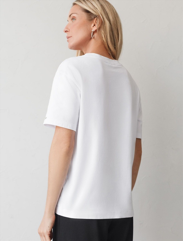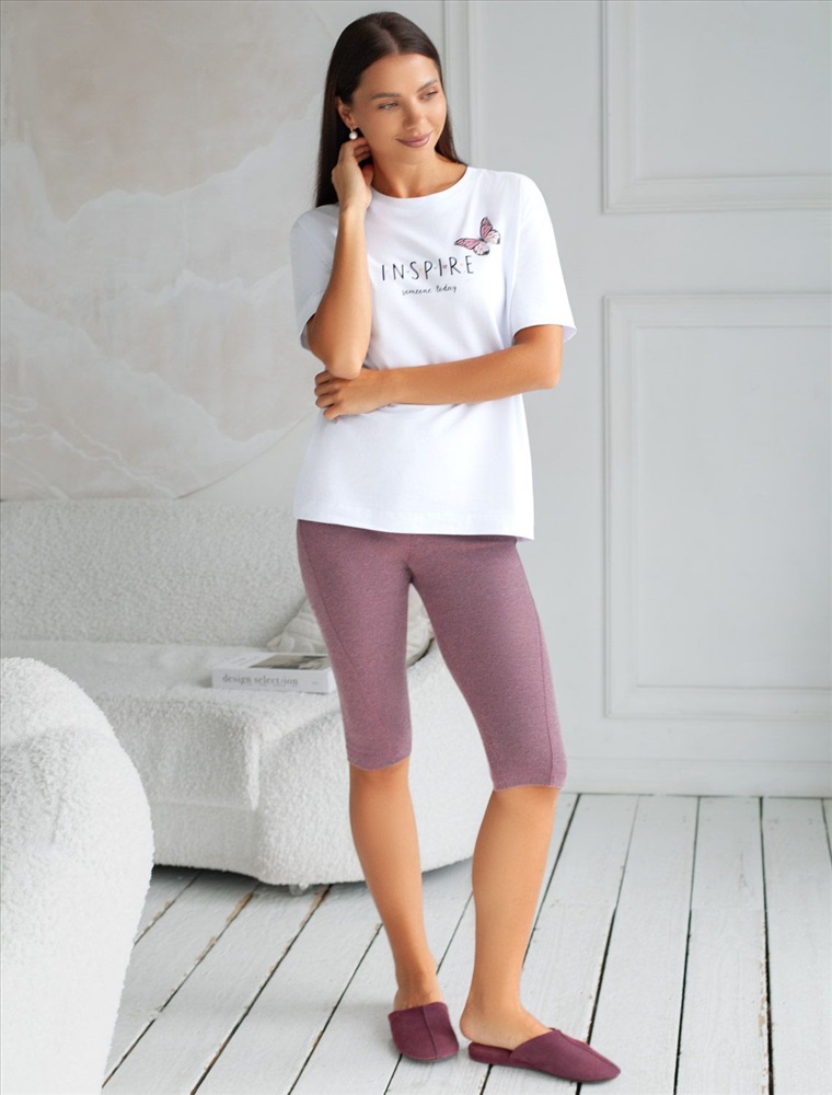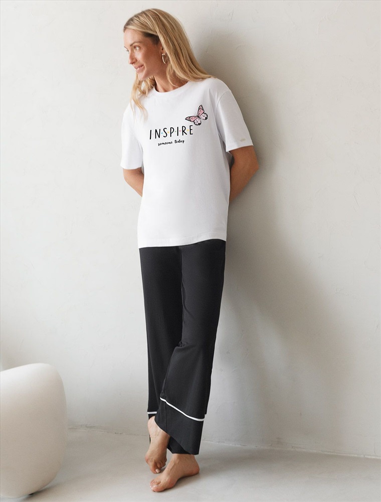 Плотность: 170 Г/м2 Размер товара на первом фото: 42 Футболка белого цвета изготовлена из премиального хлопка с эластаном, она обеспечивает невероятное ощущение уюта и легкости. Натуральный материал сохраняет форму и цвет после множества стирок, обеспечивая долговечность изделия, а его высокая воздухопроницаемость создает ощущение свежести даже в течение долгого дня. Особое внимание привлекает стильный принт в виде бабочки с минималистичной надписью, перевод надписи Inspire Someone Today - Вдохновите кого-нибудь сегодня . Принт выполненны красками с устойчивым покрытием, который добавляет изделию оригинальности и позволяет выразить индивидуальность. Свободный крой футболки дарит удобство и не стесняет движений, что делает ее идеальной для повседневной носки или активного отдыха, подчеркивает современный взгляд на моду. На рукаве металлический логотип бренда. Подойдет девушкам и женщинам на любую фигуру, вы будете чувствовать себя в ней уверенно и комфортно. Отлично впишется в гардероб благодаря универсальному дизайну, который легко сочетать с джинсами, шортами или спортивными брюками. Комментарии к товару