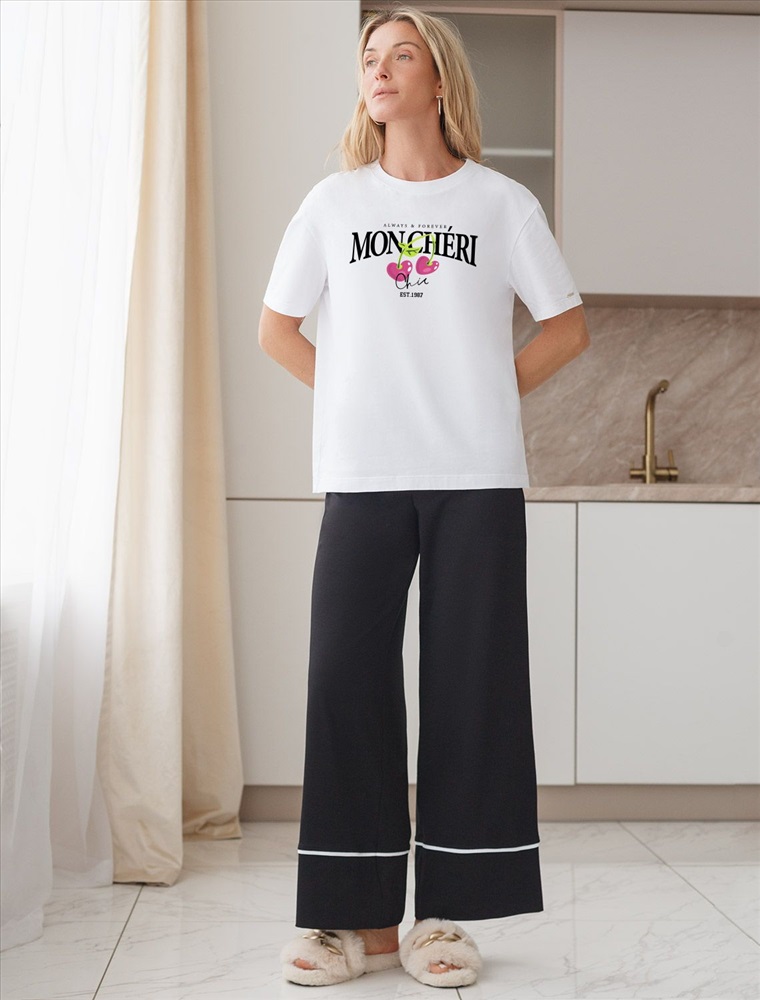 Плотность: 170 Г/м2 Размер товара на первом фото: 42 Футболка белого цвета изготовлена из премиального хлопка с эластаном, она обеспечивает невероятное ощущение уюта и легкости. Натуральный материал сохраняет форму и цвет после множества стирок, обеспечивая долговечность изделия, а его высокая воздухопроницаемость создает ощущение свежести даже в течение долгого дня. Особое внимание привлекает стильный принт в виде ягод вишни с минималистичной надписью. Перевод надписи Always and Forever Moncheri - Всегда и Навсегда Мончери. Принт выполнен красками с устойчивым покрытием, который добавляет изделию оригинальности и позволяет выразить индивидуальность. Свободный крой футболки дарит удобство и не стесняет движений, что делает ее идеальной для повседневной носки или активного отдыха, подчеркивает современный взгляд на моду. На рукаве металлический логотип бренда. Подойдет девушкам и женщинам на любую фигуру, вы будете чувствовать себя в ней уверенно и комфортно. Отлично впишется в гардероб благодаря универсальному дизайну, который легко сочетать с джинсами, шортами или спортивными брюками. Комментарии к товару