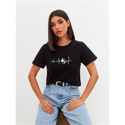 Материал: Кулирка Состав материала: 100% Хлопок Цвет: Черный Бренд: Dabl Lavl Вид изделия: Футболки женские Для: Женщин Код товара: НФ-00139773 Футболка женская, трикотажная, прямого силуэта, с О-образной горловиной. Рукав короткий, свободный. Модная печать на переде. Комментарии к товару