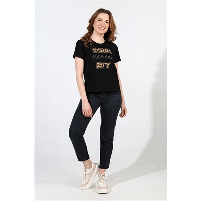 Футболка женская из х/б полотна с лайкрой. Модель с аппликацией, со слегка спущенной линией плеч, короткими рукавами.