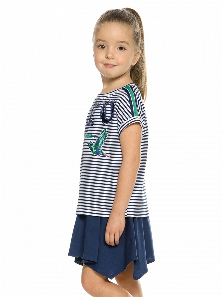 Комплект для девочек футболка и юбка. Футболка свободного объёма с цельнокроеным рукавом с отгибающейся закрепленной манжетой. Вдоль линии плеч настрочена декоративная трикотажная тесьма. По переду изделия принт с разноцветным глиттером в виде птичек колибри и надписи, перевод Блестящее будущее , и вышивка из переливающихся переворачивающихся пайеток. Юбка - Новинка. Прямоугольная юбка с фигурной угловатой линией низа, пояс на широкой внутренней резинке. Товары ТМ Pelican отгружаются без скидок, все цены фиксированные от производителя. Обратите внимание: Товары ТМ Pelican находятся на удаленном складе. Как определить размер?Все таблицы размеров Pelican (откроется в новом окне)Комментарии к товару