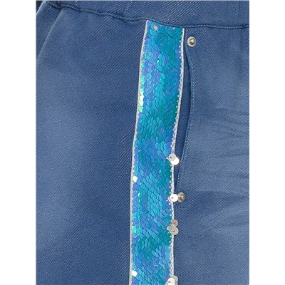 Свободные шорты из трикотажа, имитирующего деним. По бокам нашивные лампасы из переливающихся переворачивающихся пайеток. Карманы в боковых швах с металлической фурнитурой. Пояс на широкой внутренней резинке с регулировкой шнурком.