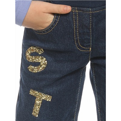 Прямые джинсы для девочек с начёсом из эластичного денима, слим силуэт, металлическая фурнитура, пояс из рибаны с регулировкой ширины. Правая половина декорирована сверкающей аппликацией из страз. Перевод надписи Звезда.