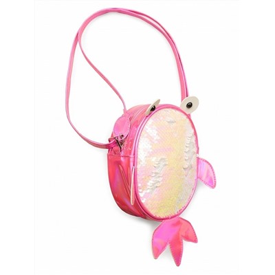 Сумочка из искусственной кожи с голографическим лакированным покрытием в форме рыбки с длинным регулируемым ремешком. Сумка хорошо держит форму. Пришивной декор и двухсторонние пайетки с перламутровым блеском. Пуллер рыбка.