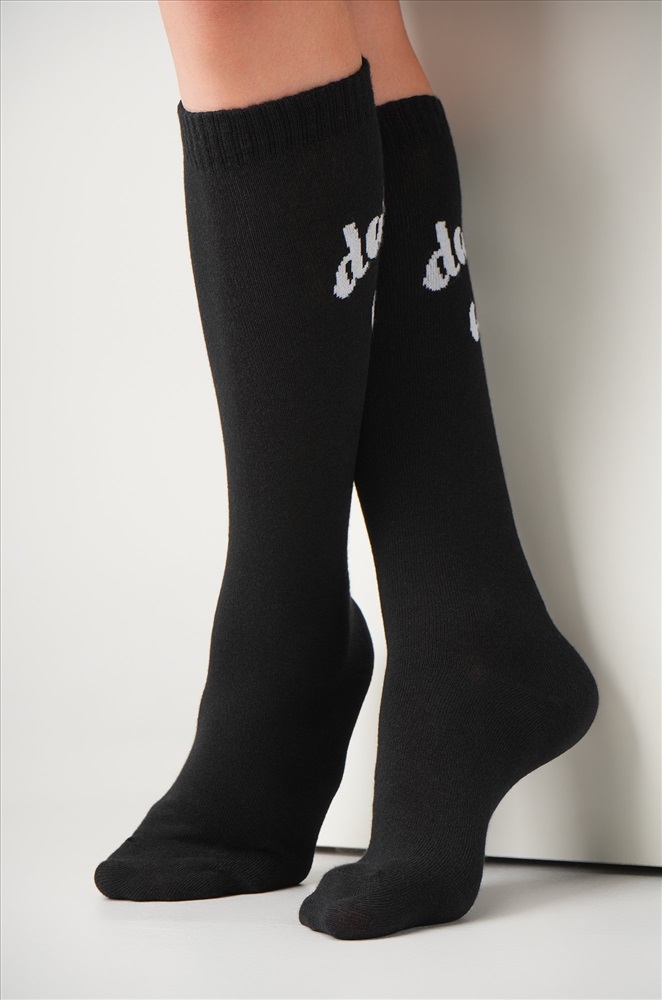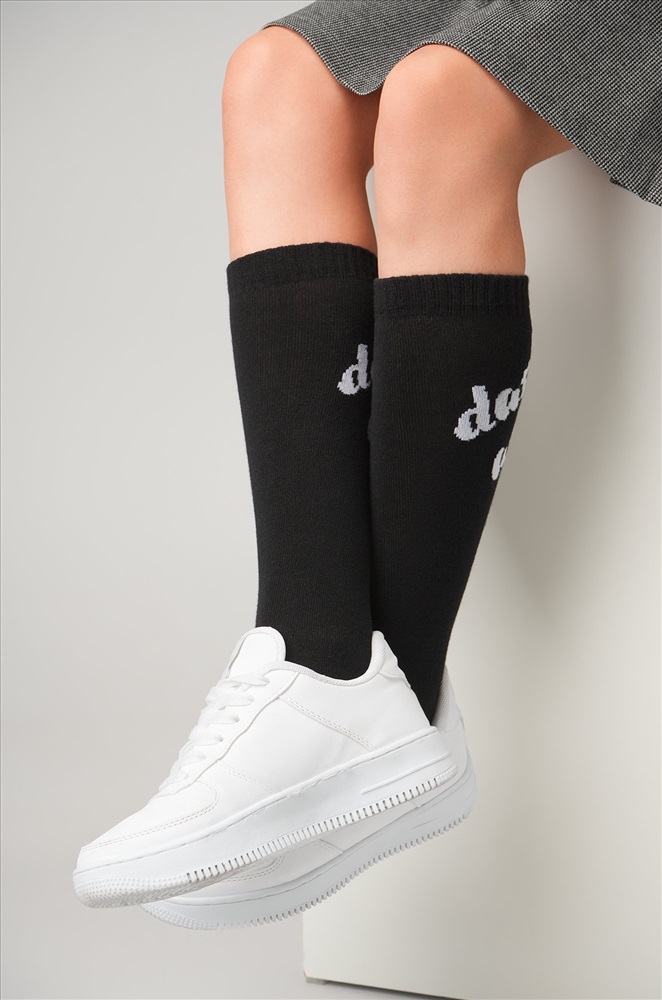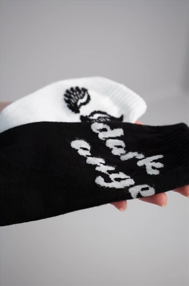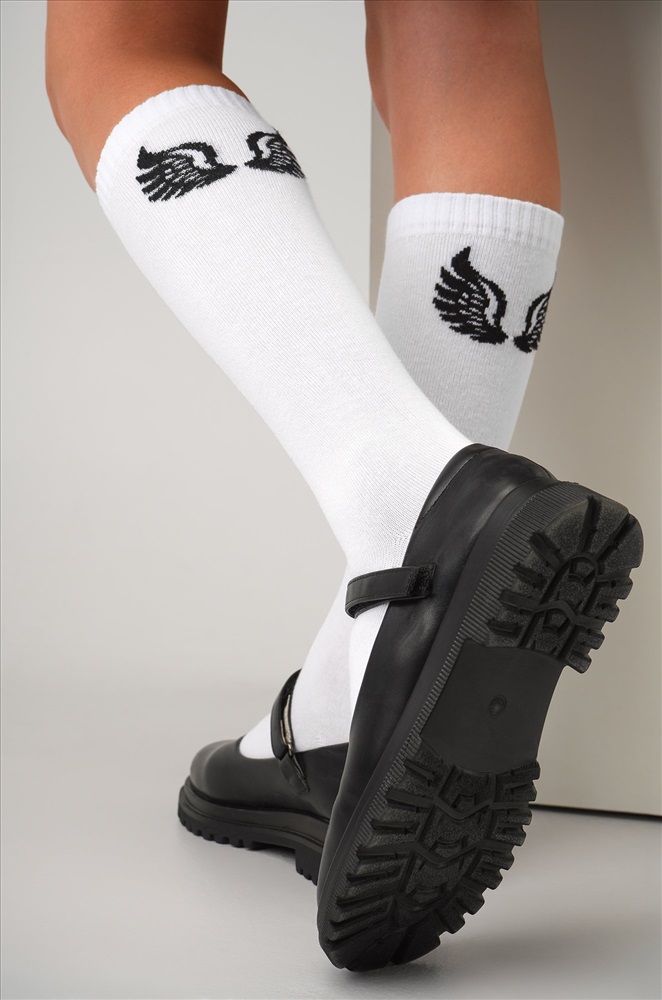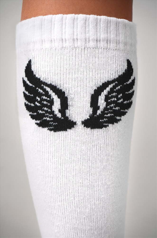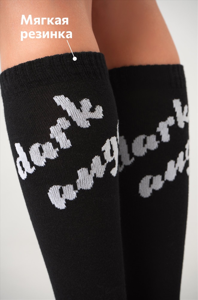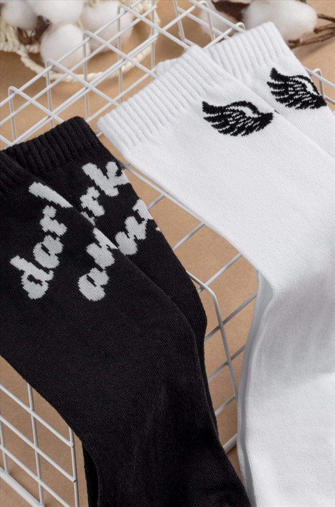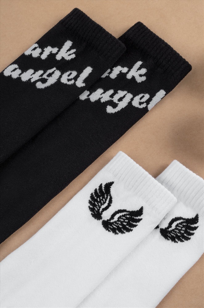 Набор гольфов для девочек и девочек-подростков выполнен из натурального хлопка с добавлением синтетических волокон. В комплекте 2 пары. Белые гольфы украшены рисунком Крылья. Черные гольфы дополнены надписью Dark Angel.